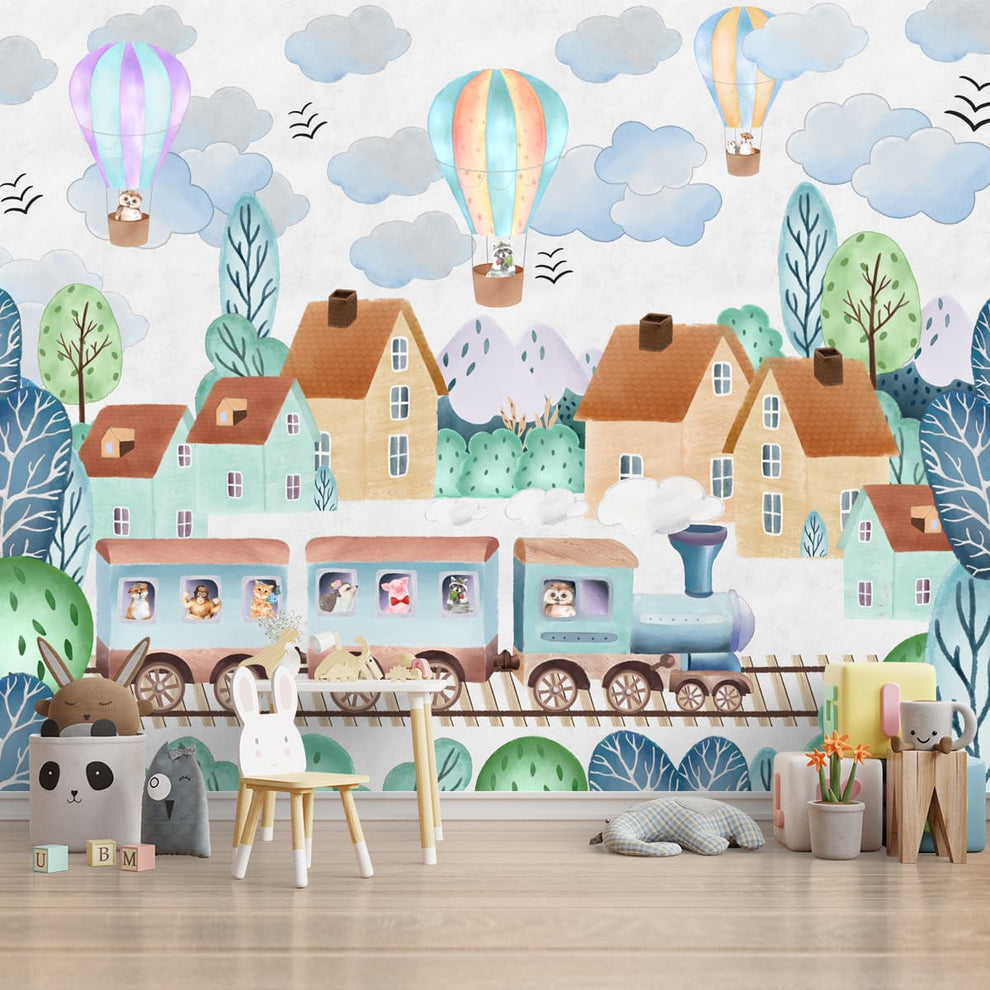 Rund um die Stadt, süßes Zug-Tapetendesign für Kinder | Maßgeschneidert | Klare und lebendige Drucke | Pflegeleicht | Leben und Farben | Hergestellt in Indien