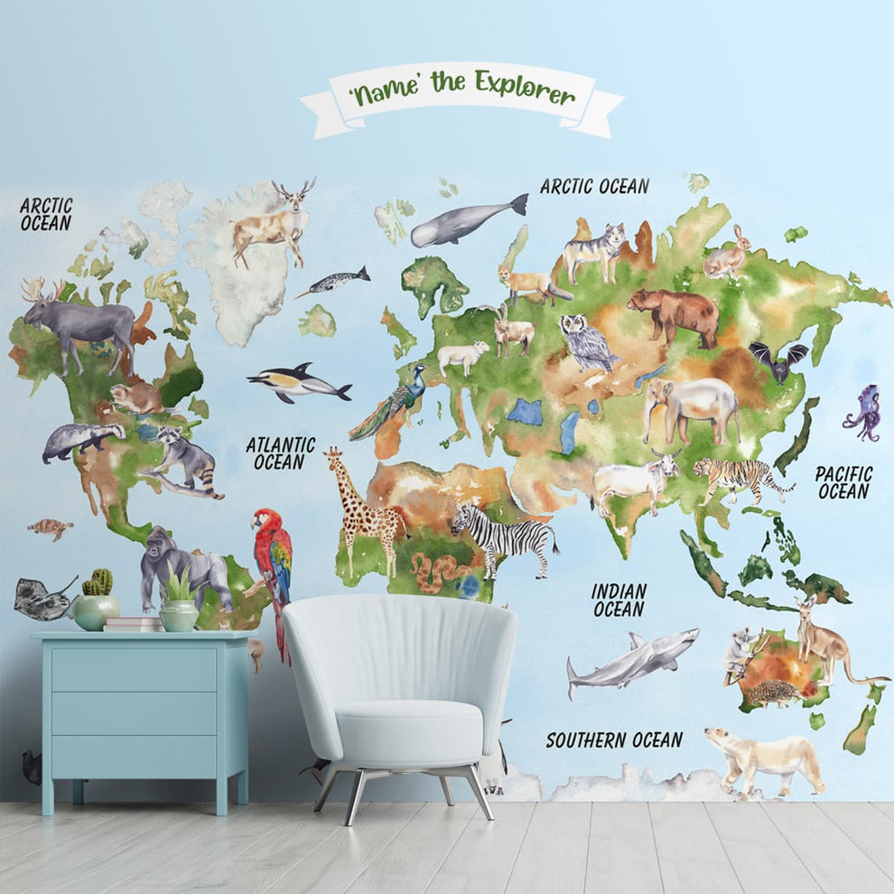 Personalisierte bunte Weltkarten-Tapete für Kinderzimmerwände
