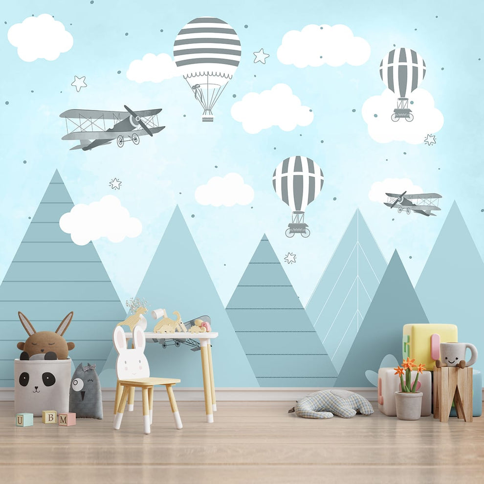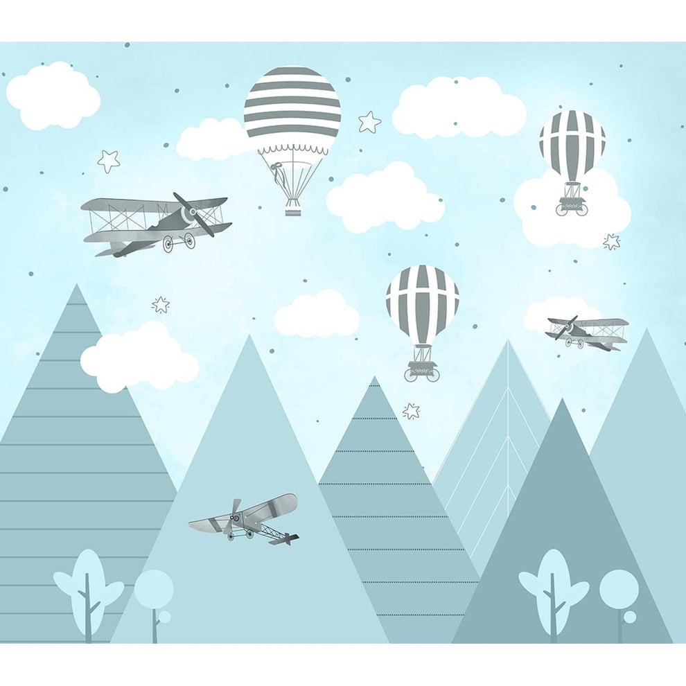 Tapete mit Segelflugzeugen und Heißluftballons, Blau | Maßanfertigung | Klare und lebendige Drucke | Pflegeleicht | Life n Colors | Hergestellt in Indien