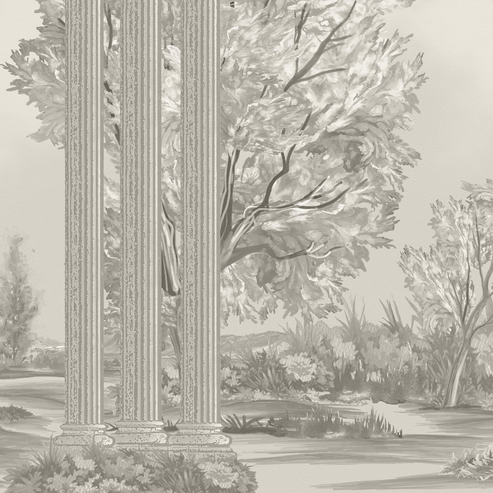 Bringen Sie die Pracht des antiken Griechenlands in Ihr Zuhause mit Greek Retreat, einer klassischen Tapete mit einem atemberaubenden Schwarz-Weiß-Design, das die Fassade griechischer Architektur zeigt, ergänzt durch das üppige Laub der umliegenden Bäume. Werten Sie die Atmosphäre jedes Raumes mit dieser zeitlosen Tapete auf, die Klasse und Eleganz ausstrahlt.