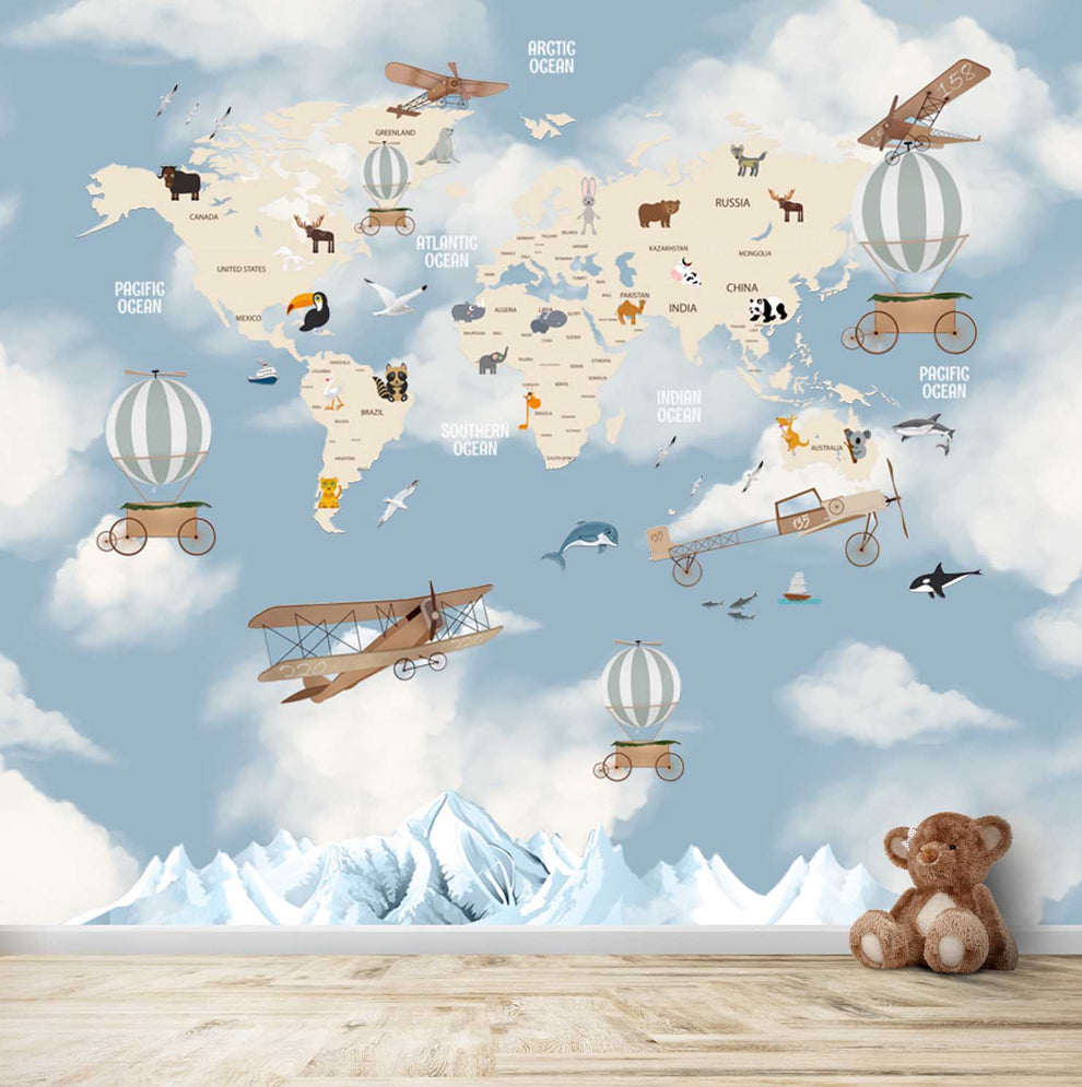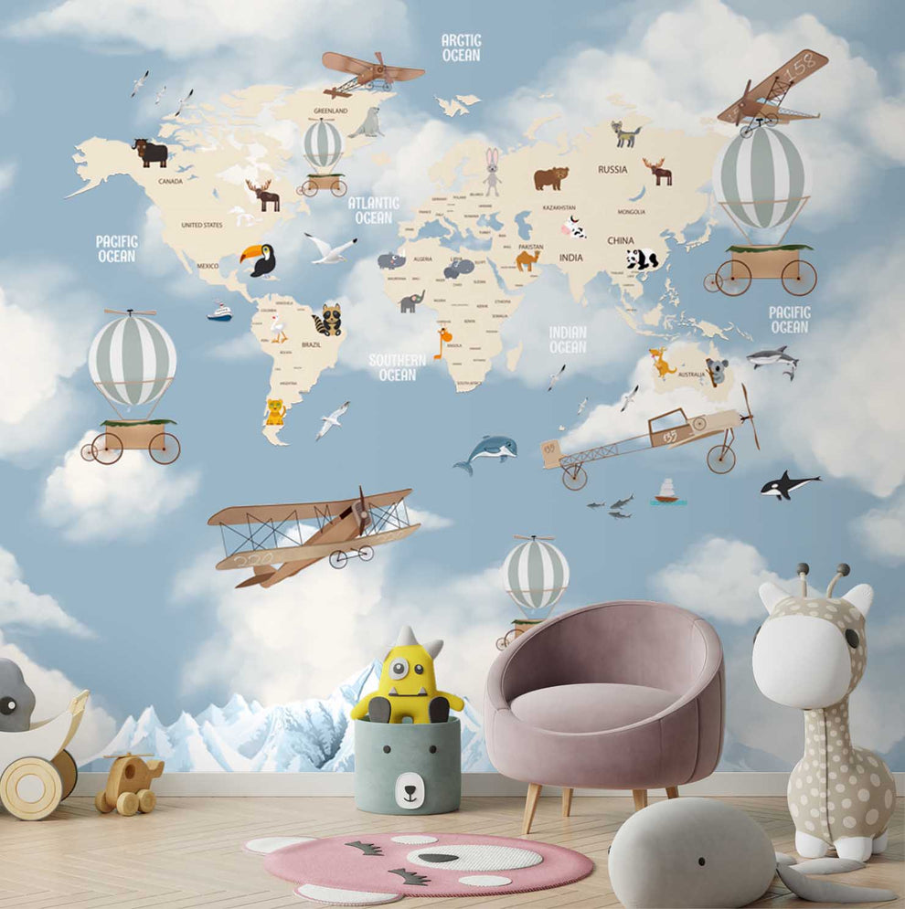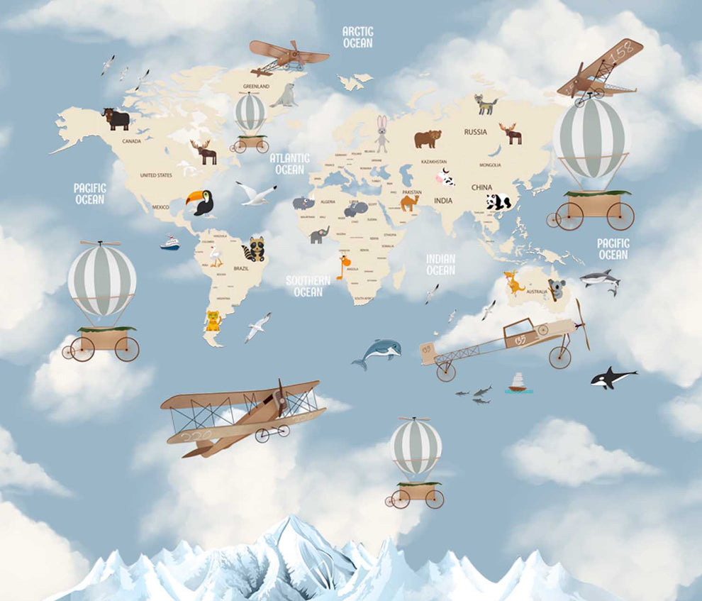 Weltkarte mit Heißluftballons und Segelflugzeugen, Wandgemälde für Kinder, Blau