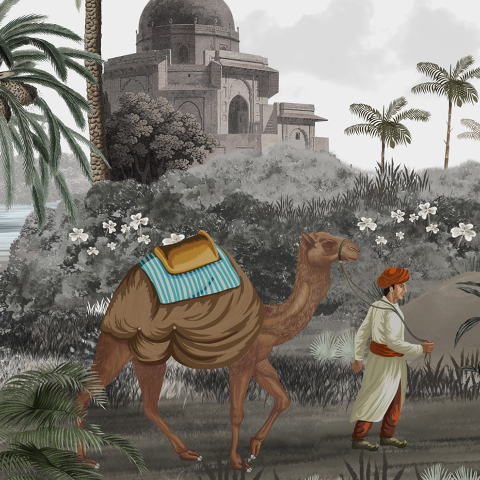 Auf dem Wandgemälde „Life n Colors Jodhpur“ kehrt ein Mann aus Rajasthani mit einem bunten Turban mit einem Kamel durch einen Wald zu seinem Haus zurück. Eine Festung im Hintergrund veranschaulicht den Reichtum der kulturellen Vielfalt Rajasthans. Purpurrote Akzente unterstreichen die Pracht dieser grauen und gedämpften Tapete.