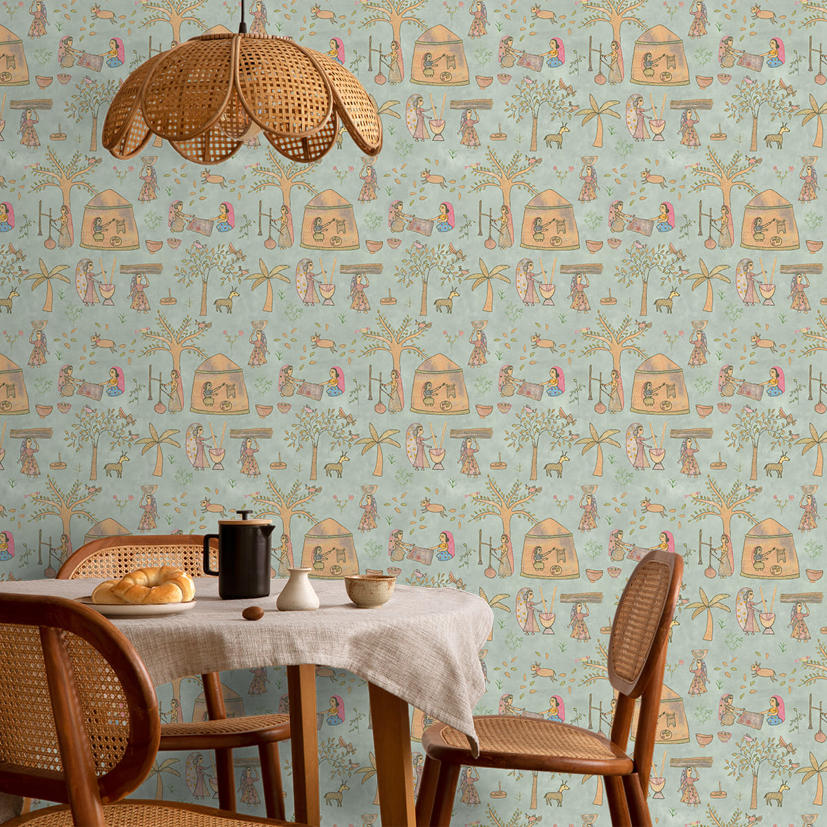 Wir präsentieren „Mithila“ – eine Tapete, die die Kunst Sujanis mit dem lebendigen ländlichen Leben im Herzen Mithilas verbindet. Diese Tapete ist eine Hommage an die beständigen Traditionen Mithilas, wo Kunst und Alltag nahtlos ineinander übergehen. Sie ist ein Fenster zur Seele Mithilas, und jeder Strich zeichnet ein lebendiges Bild der ländlichen Schönheit, die in Mithilas Landschaft gedeiht. Sage