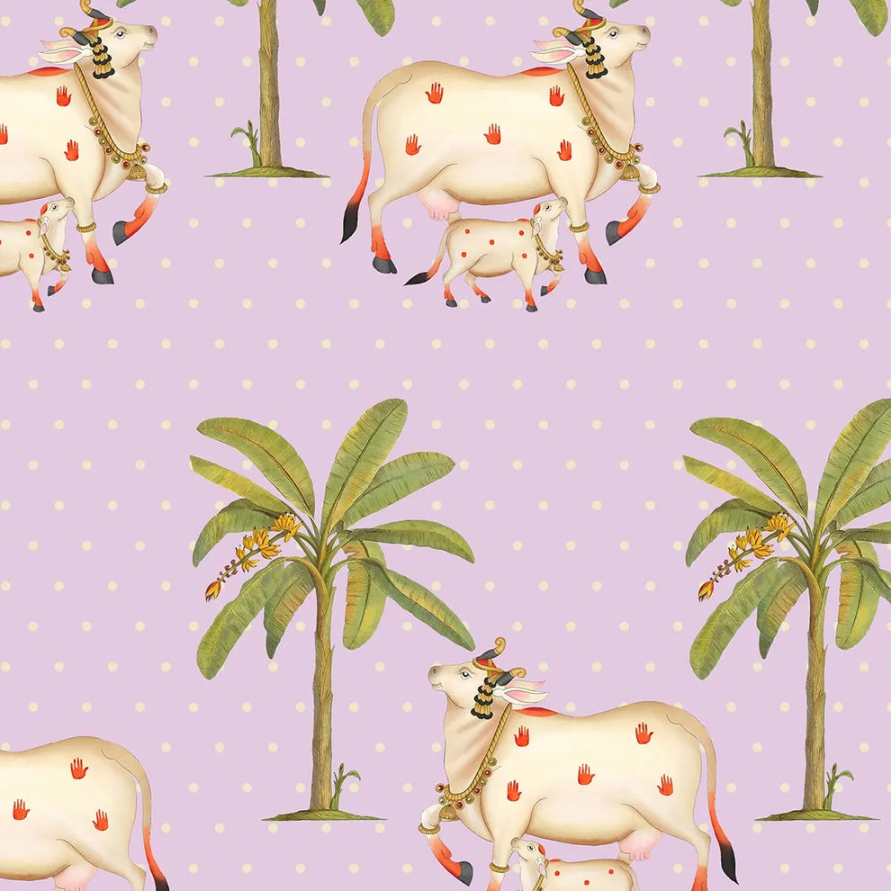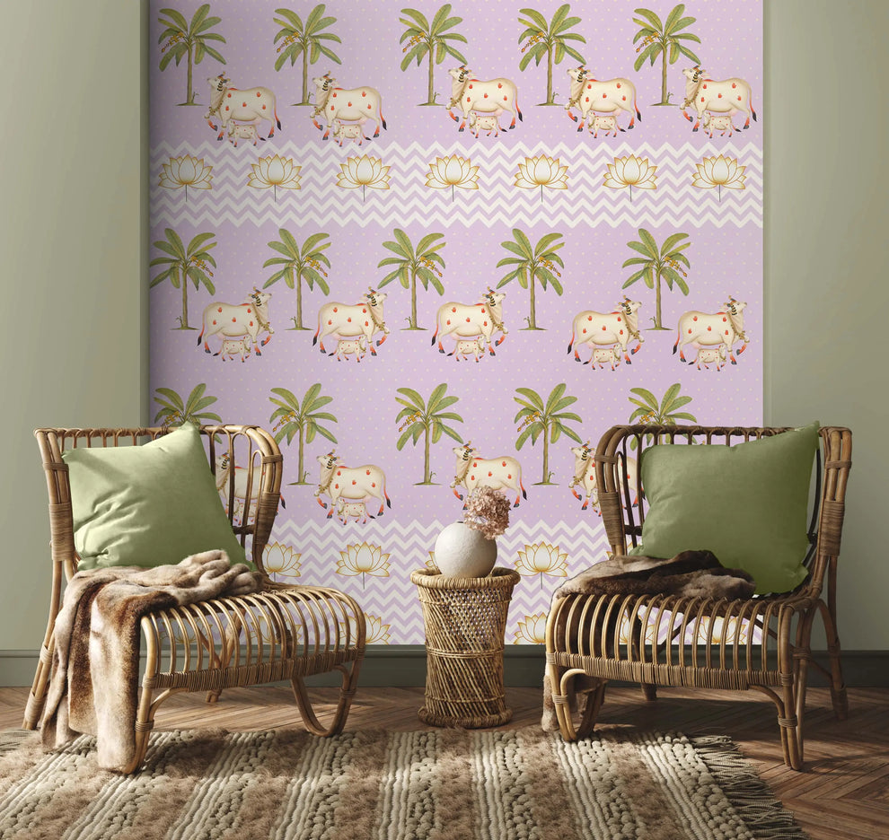 Tapete mit Pichwai-Kühen im malvenfarbenen Chevron-Muster