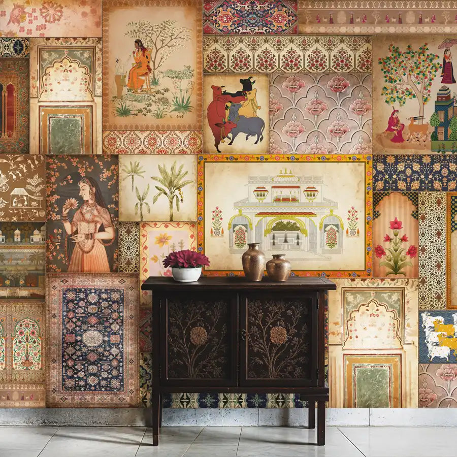 Racontez votre histoire avec Kahani, papier peint sur le thème de l'art indien, personnalisé pour différents types de pièces comme le salon, les chambres et les espaces commerciaux.
