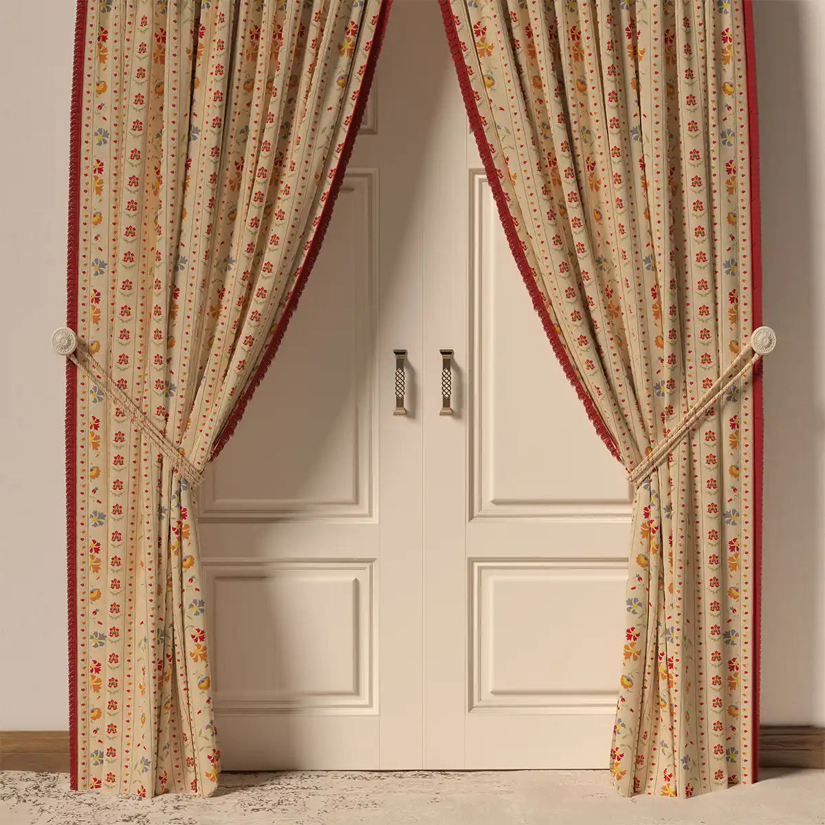 • Bring a cheerful, classic feel to your home with our Bela Fringes Curtain. This charming curtain features vertical stripes with delicate floral and heart-like motifs in vibrant red, blue, and yellow. A prominent red fringe border runs along the edge, creating a striking contrast and adding a unique texture. Perfect for living rooms, bedrooms, or any space needing a pop of color, the Bela Fringes Curtain beautifully filters light while infusing your windows with elegant, whimsical style.