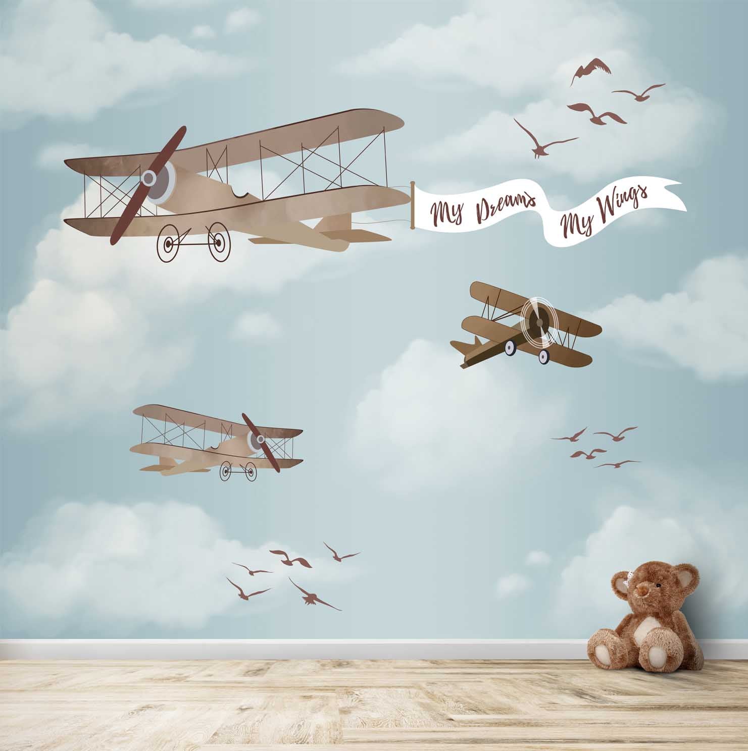 Papier peint personnalisé sur le thème des planeurs et des avions pour la chambre des enfants | Fait sur mesure | Impressions claires et vibrantes | Facile à entretenir | Vie n Couleurs | Fabriqué en Inde