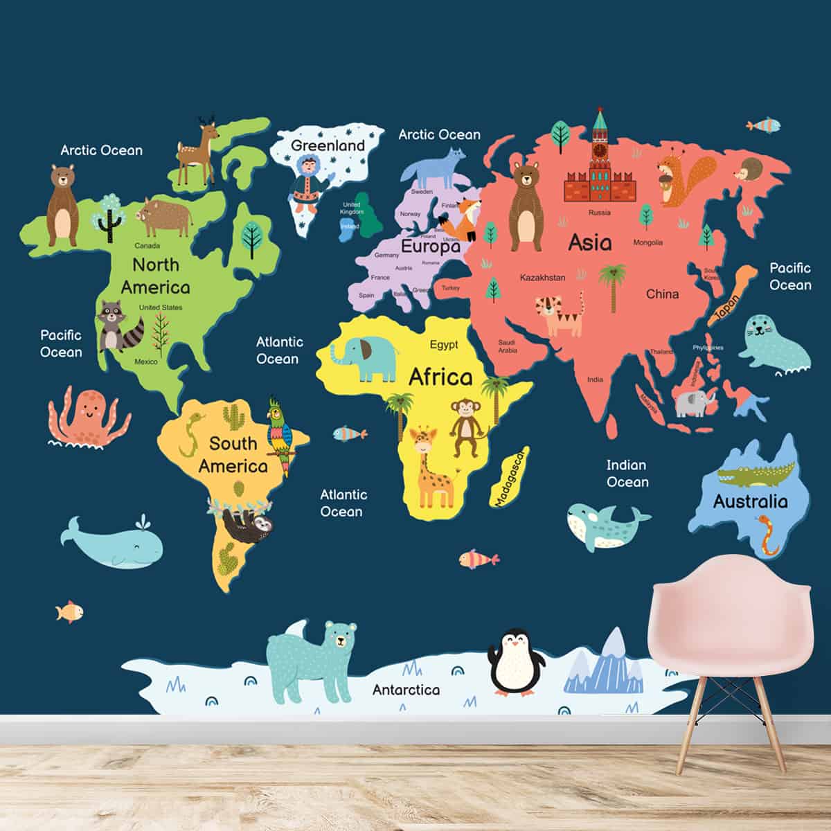 Carte du monde colorée avec des animaux pour papier peint de chambre d'enfant | Fait sur mesure | Impressions claires et vibrantes | Facile à entretenir | Vie n Couleurs | Fabriqué en Inde
