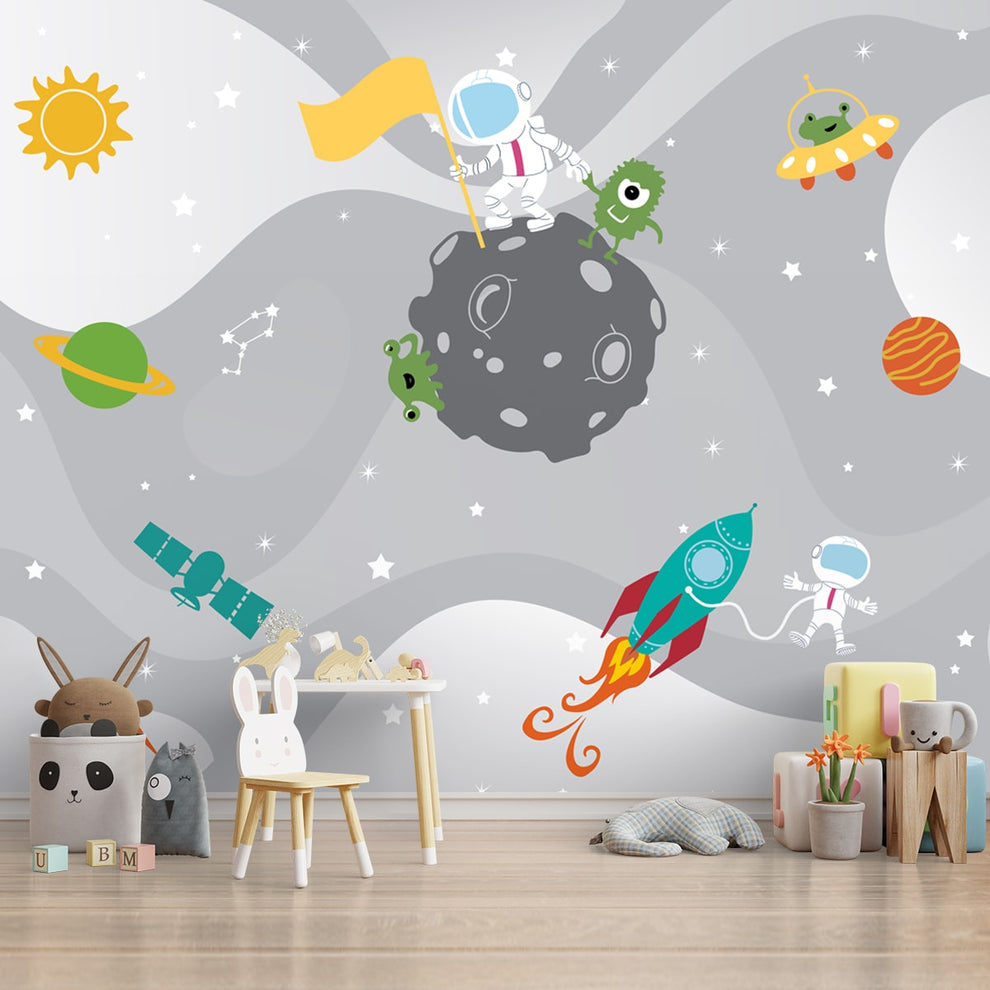 Papier peint pour chambre d'enfant sur le thème de l'espace mignon, personnalisé | Fait sur mesure | Impressions claires et vibrantes | Facile à entretenir | Vie n Couleurs | Fabriqué en Inde