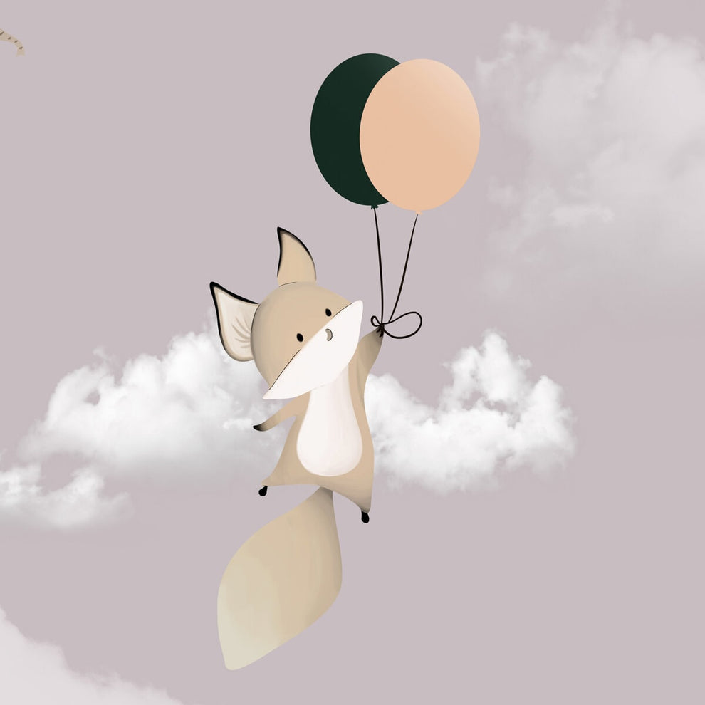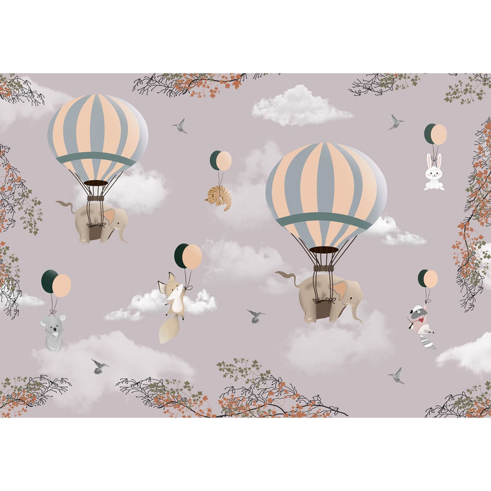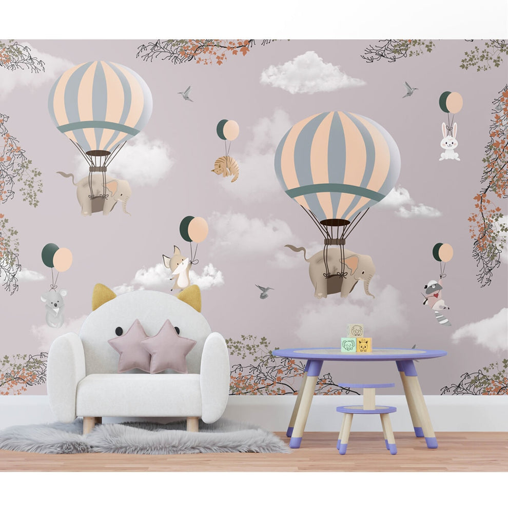 Animaux volants sur des montgolfières Conception de papier peint pour les enfants | Fait sur mesure | Impressions claires et vibrantes | Facile à entretenir | Vie n Couleurs | Fabriqué en Inde