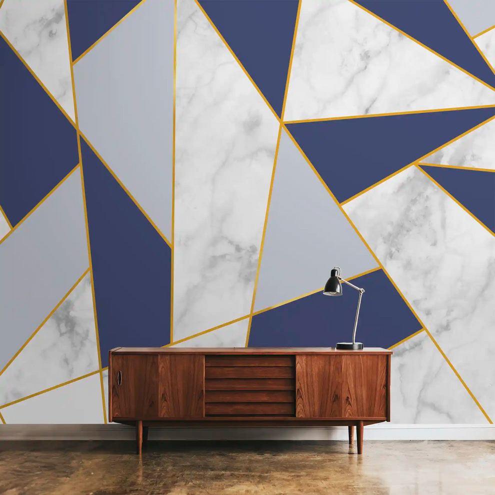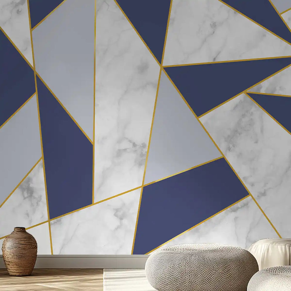 Rayures dorées avec papier peint de salle de conception en marbre | Fait sur mesure | Impressions claires et vibrantes | Facile à entretenir | Couleurs de vie | Fabriqué en Inde