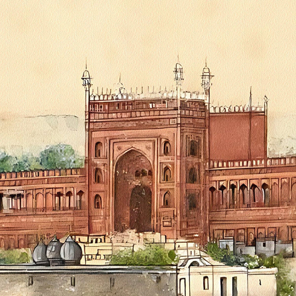Imperial Delhi" - un papier peint grandiose et majestueux qui met en valeur la beauté et la grandeur de l'architecture ancienne de Delhi, dans un style de peinture vintage, inspirant un sentiment de crainte et d'émerveillement.