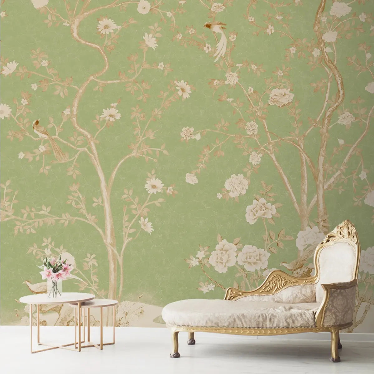 Papier peint chinoiserie vintage en fleurs de menthe pour murs