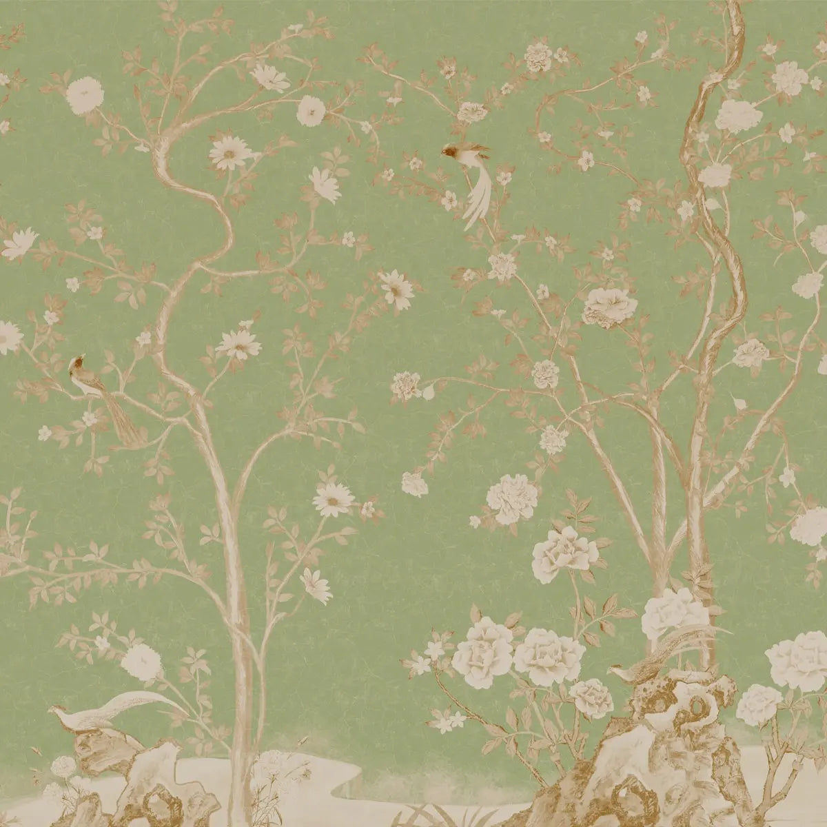 Dans des teintes délicates de vert clair vintage, « Mint Blossom » se déploie, où sont cousus des motifs de papier peint chinoiserie complexes à la grâce intemporelle.
