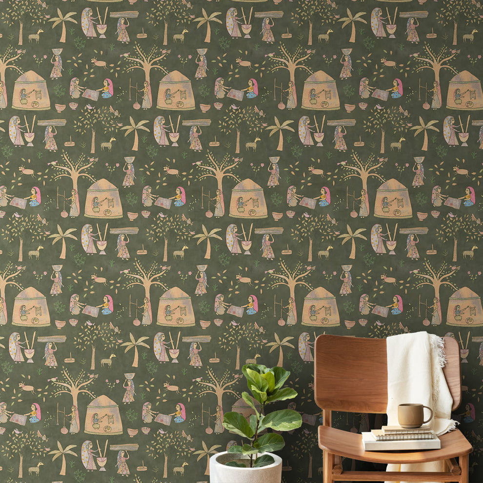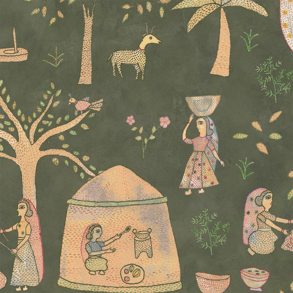 Mithila Indian Sujani Art Papier peint vert foncé pour mur