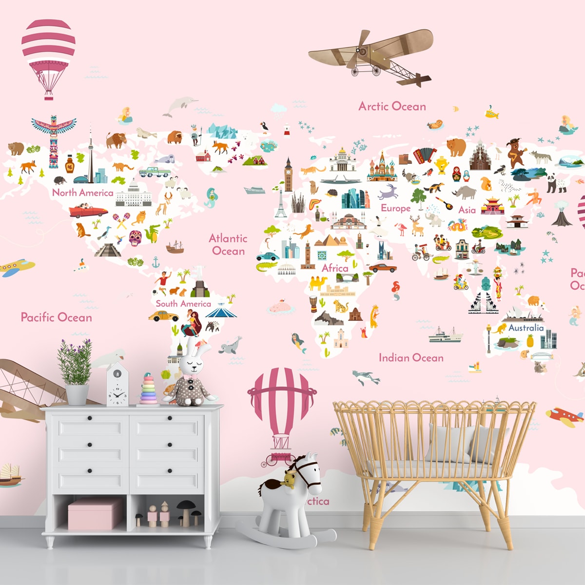 Carte du monde de la chambre des filles roses Fond d'écran | Fait sur mesure | Impressions claires et vibrantes | Facile à entretenir | Vie n Couleurs | Fabriqué en Inde