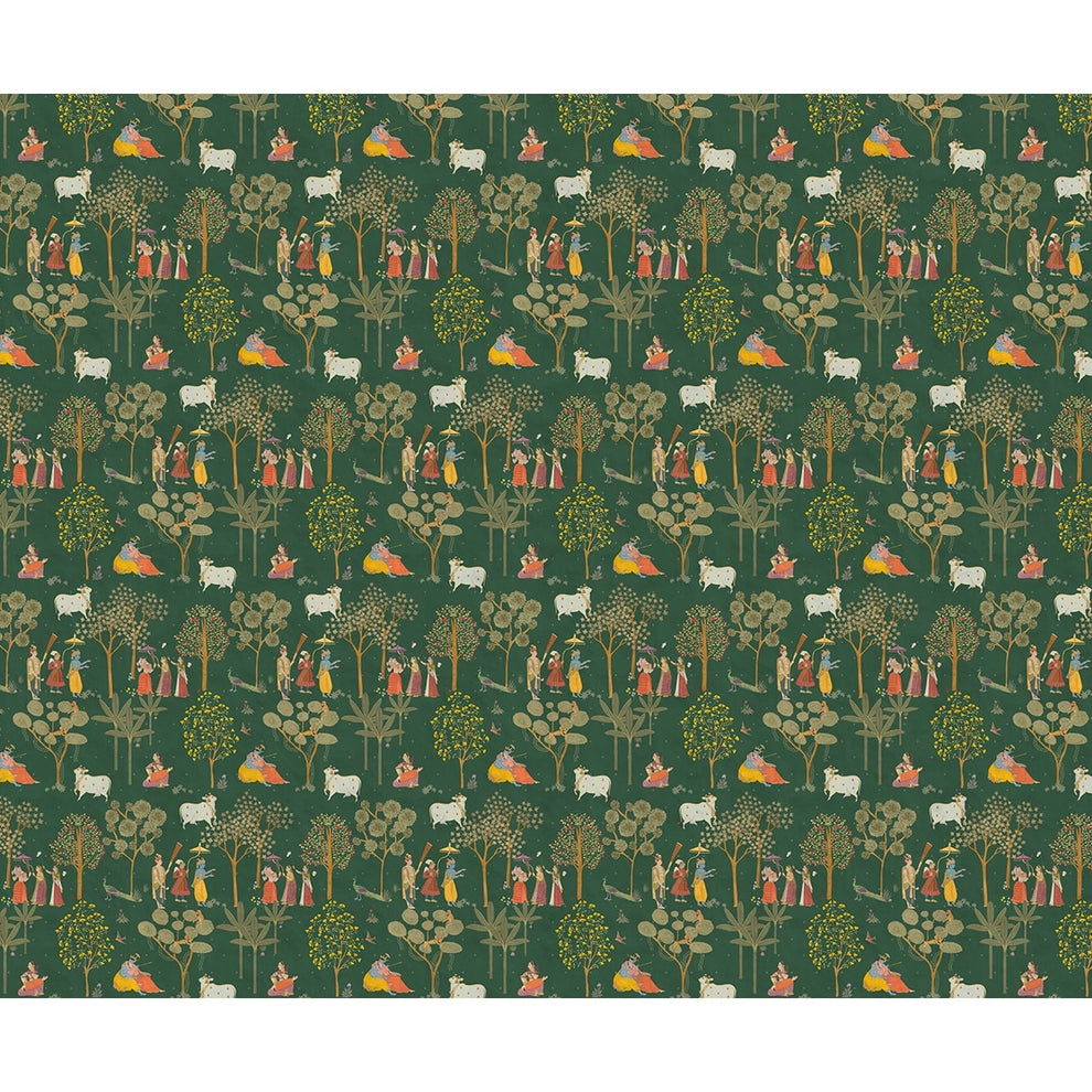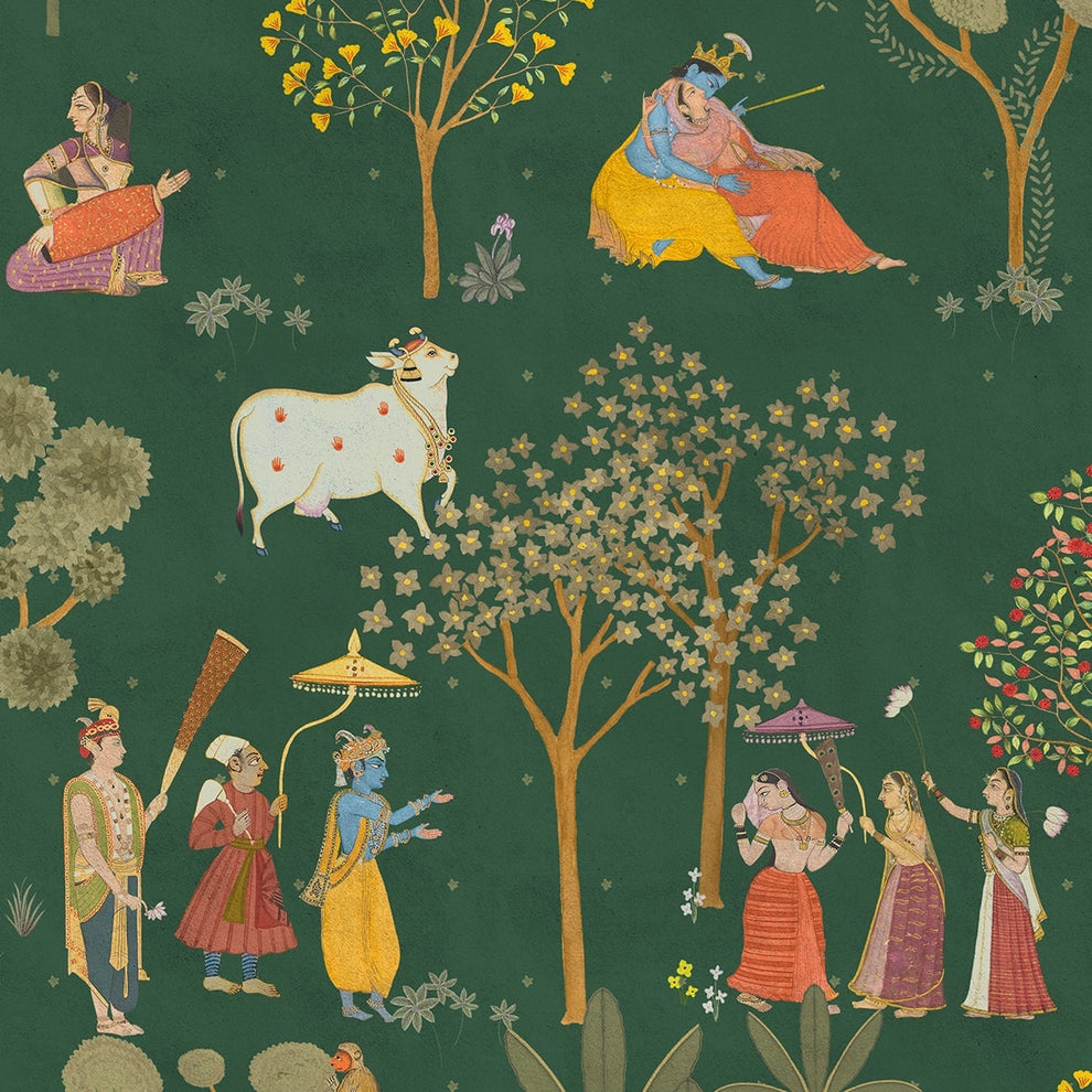 Célébrez l'amour divin et le luxe avec le papier peint de luxe vert émeraude Sangam Radha Krishna. Ce papier peint raffiné arbore des tons vert émeraude opulents associés à des motifs complexes inspirés des contes intemporels de Radha Krishna, parfaits pour les salons élégants, les chambres et les hôtels haut de gamme. Fièrement neutre en carbone et fabriqué avec des matériaux durables et une impression écologique, il garantit une qualité durable et une pose facile. Avec sa grandeur et sa richesse culturelle, ce papier peint personnalisé de Life n Color s'impose comme l'une des meilleures marques de papier peint en ligne.