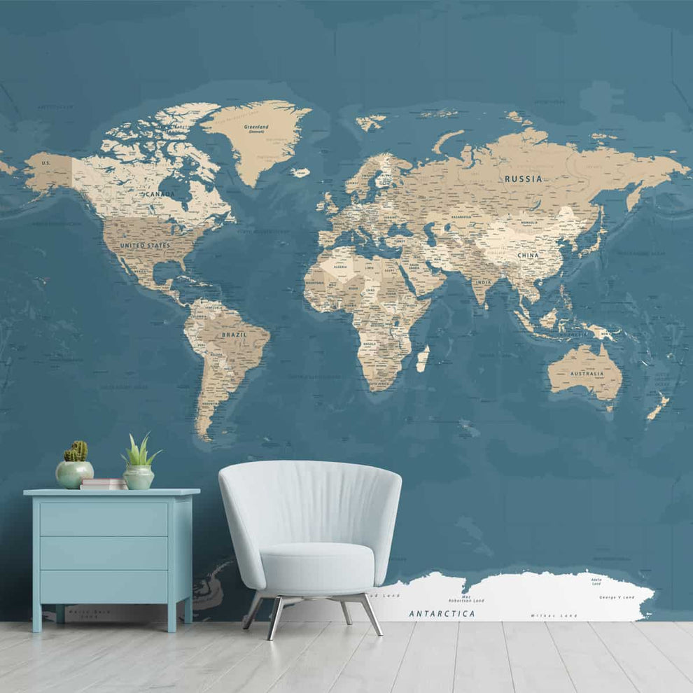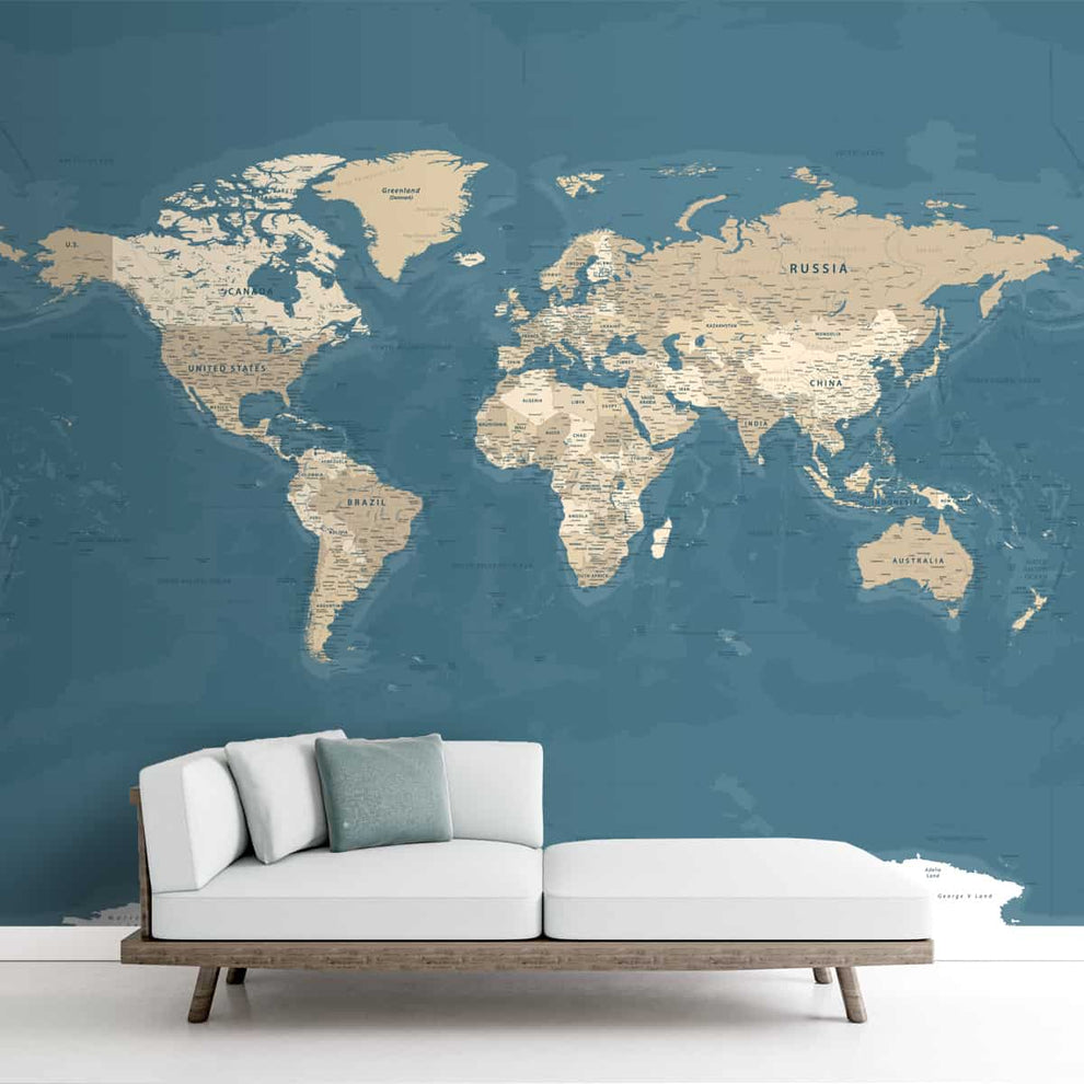 Papier peint vintage sur fond bleu et beige | Matériaux durables | Facile à entretenir | Vie n Couleurs | Fabriqué en Inde