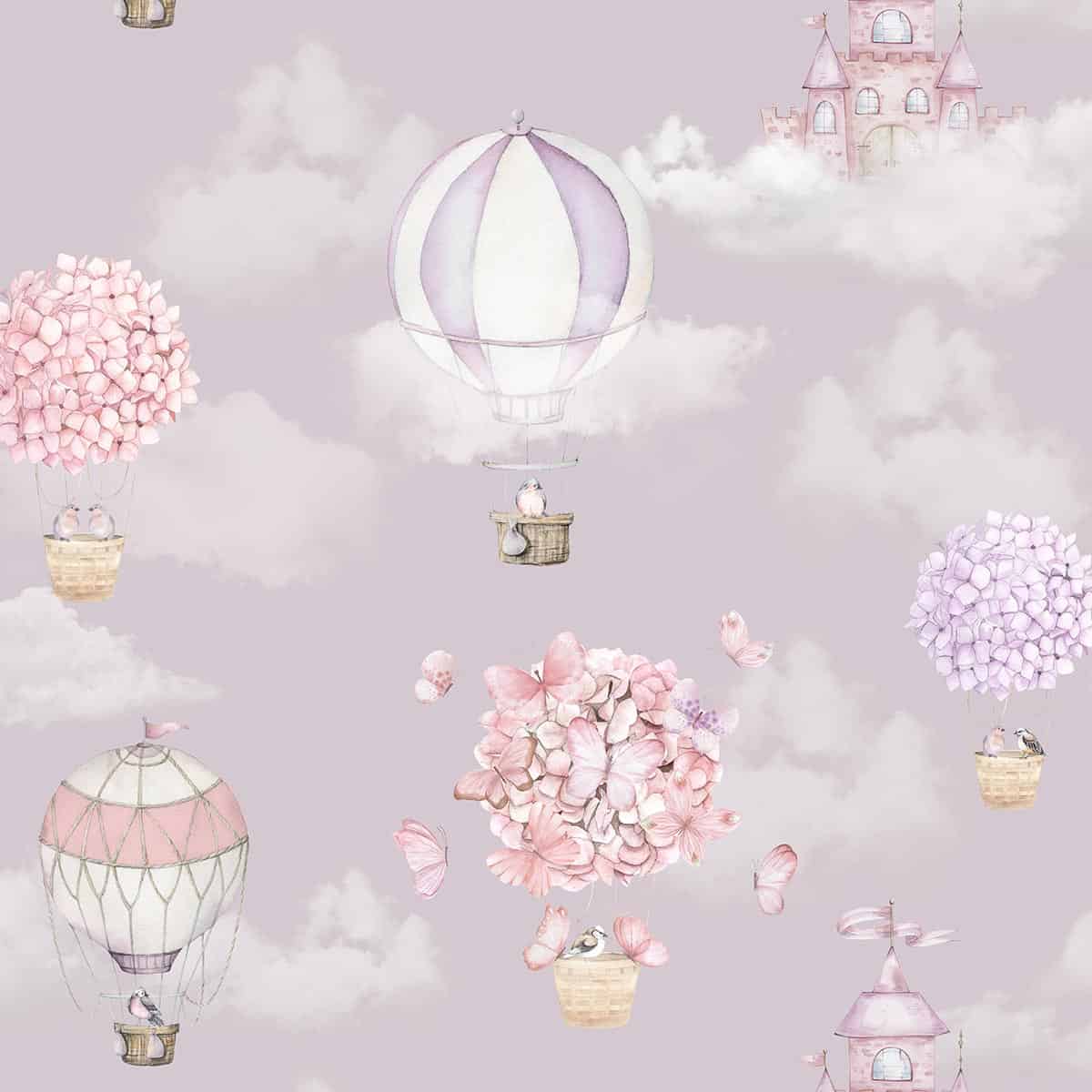 Balloons of Blooms, Adorable Hot Air Balloon Wallpaper for Girls Room, Lilac