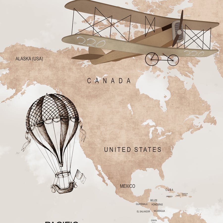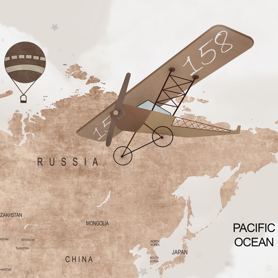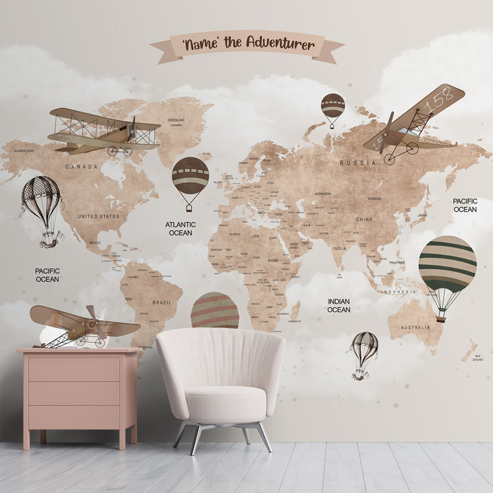 Wall Size World Map, Beige, Gliders and Balloons, Kids Room Wallpaper