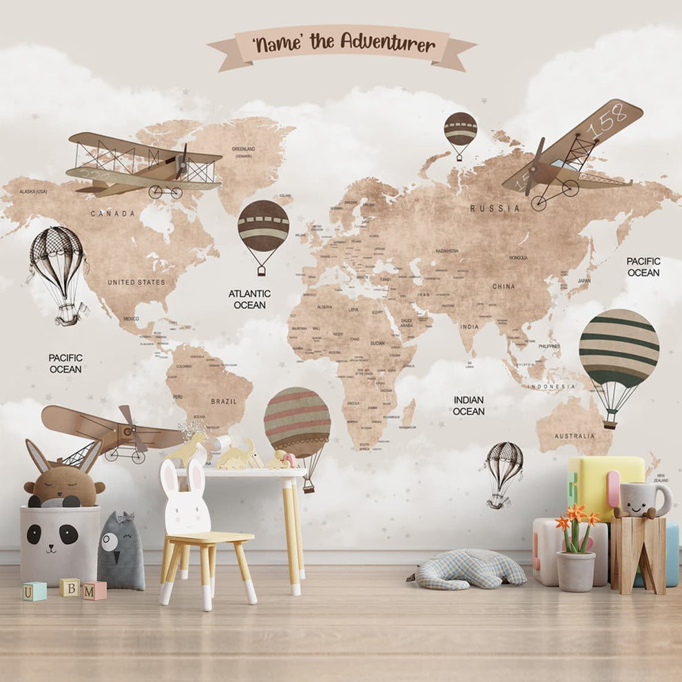 • Wall Size World Map, Beige, Gliders and Balloons, Kids Room Wallpaper | Custom made | Clear & vibrant prints | Easy to maintain | Life n Colors | Made in India