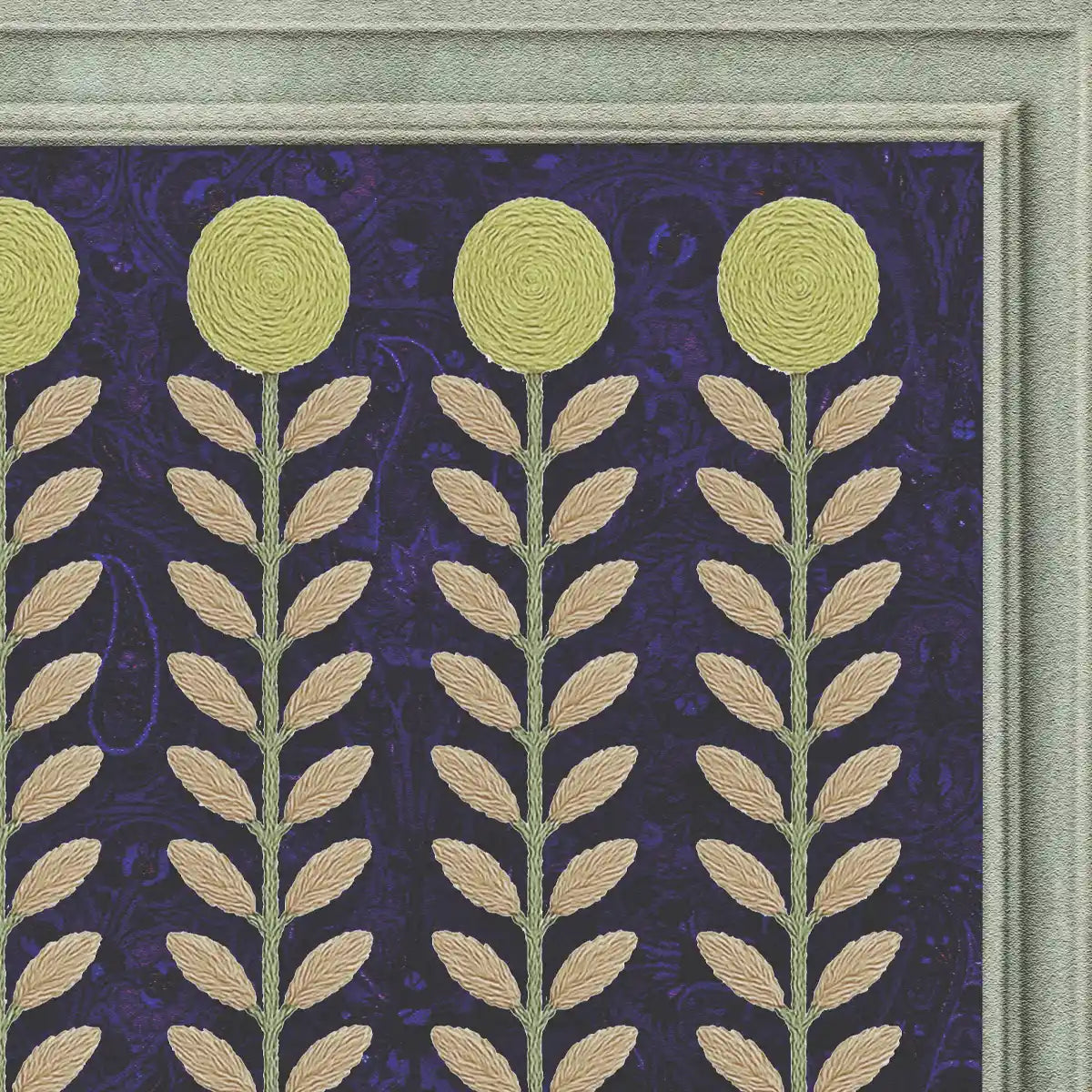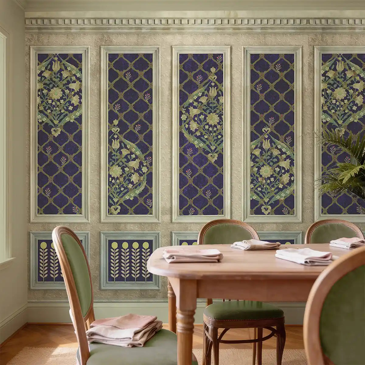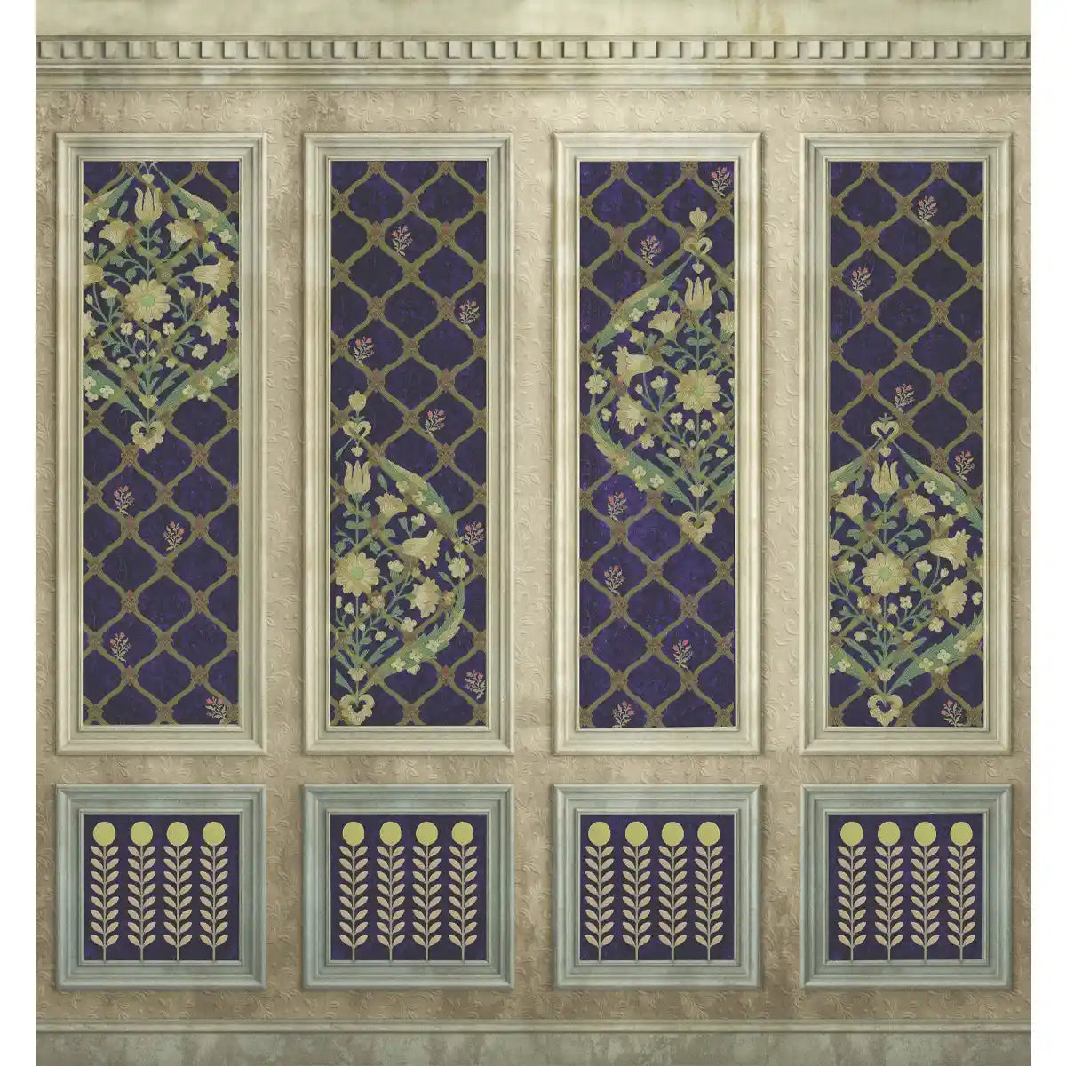 This wallpaper creates the illusion of architectural elegance, a delicate lattice pattern plays host to trailing blue blossoms, while the lower wainscoting is detailed with rows of golden blooms, blending structural grandeur with botanical softness. The weathered, hand-painted finish gives the walls the character of a discovered fresco, grounding the space in classical beauty.