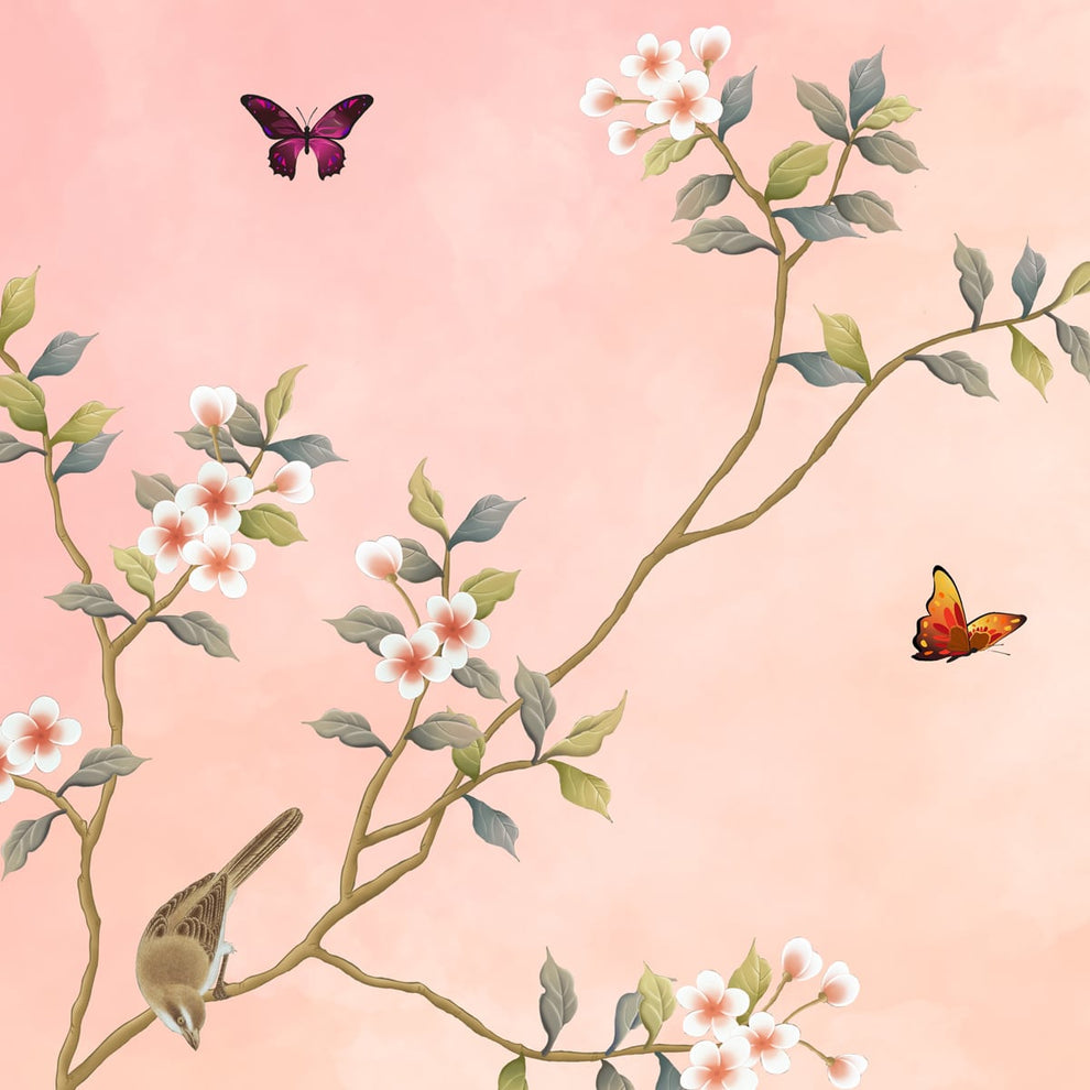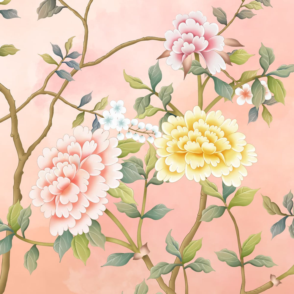 Blossom, Peach Chinoiserie Wallpaper, suitable for bedrooms, living rooms, lobby, dining areas. Vastu compliant wallpaper for bedrooms.