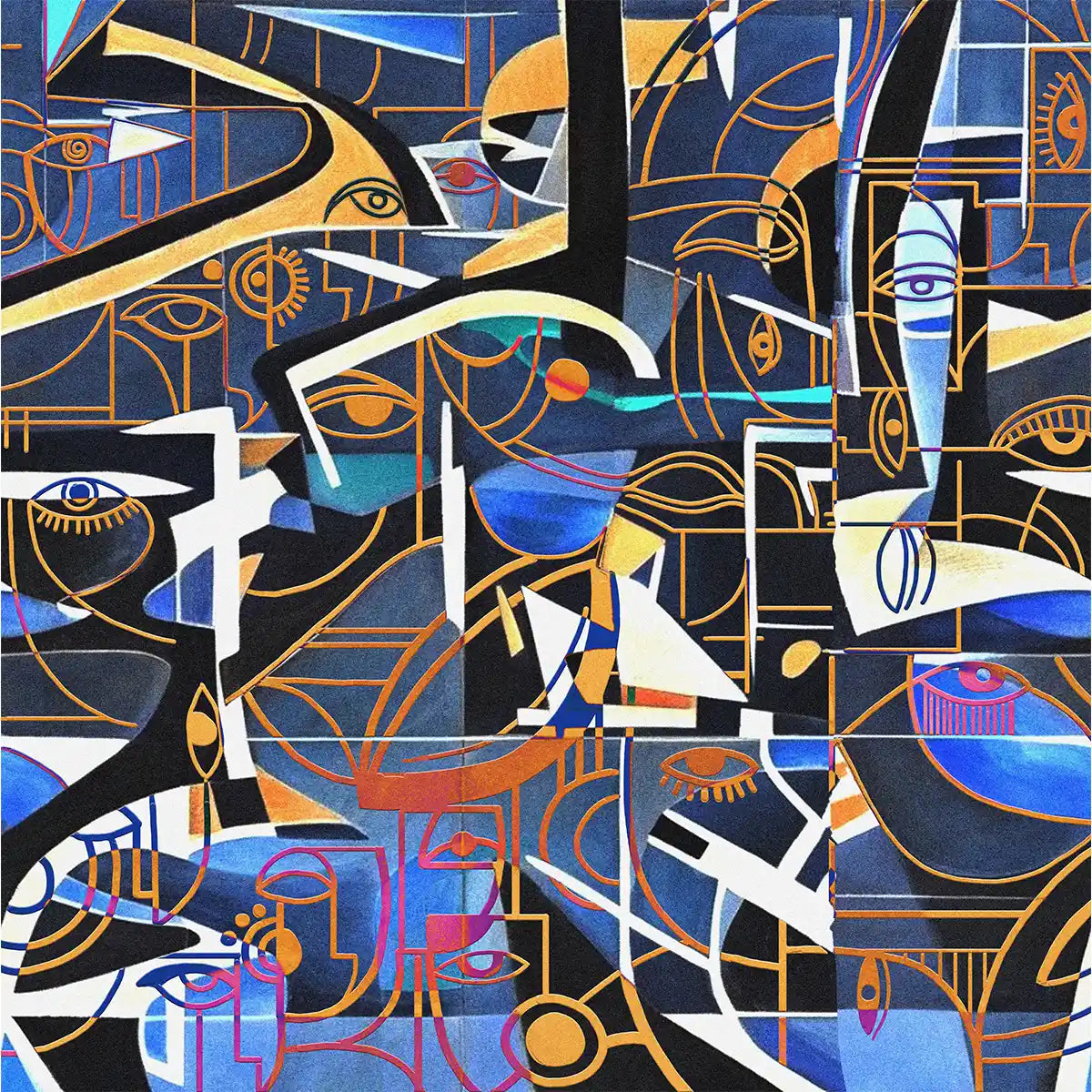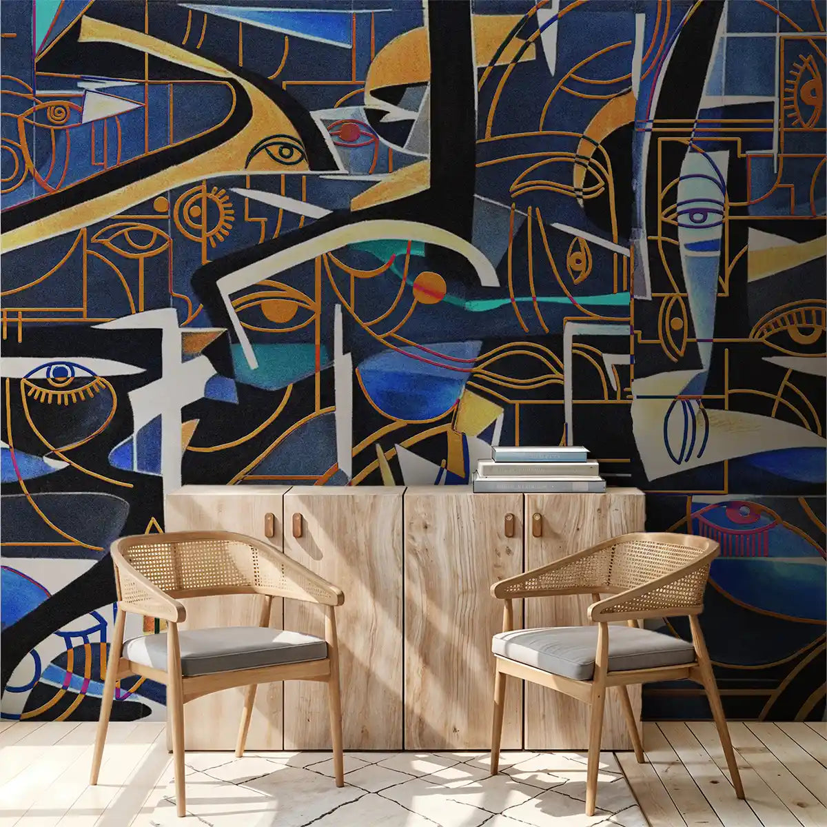 Inspired by cubist movements, this design features bold geometric shapes, expressive faces, and striking color contrasts in deep blue, gold, black, and white. Its dynamic composition adds energy, depth, and creativity to any room, making it perfect for living spaces, studios, or feature walls. Designed for those who love statement art, this wallpaper brings contemporary sophistication and artistic flair into your interiors.