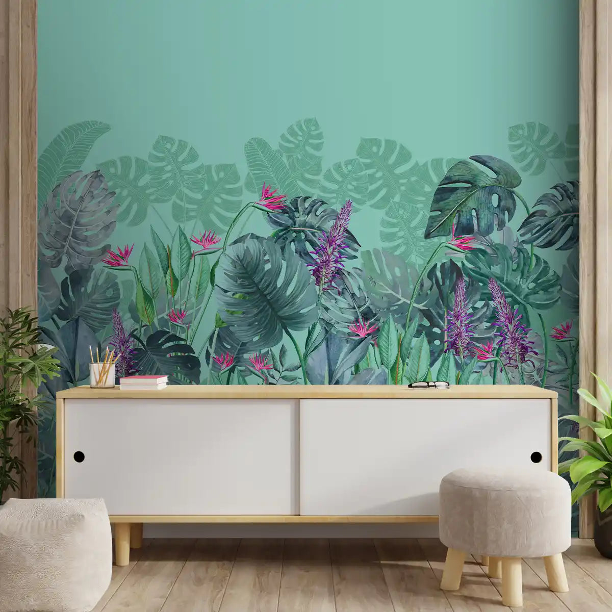 Charm, Nature Theme Based Tropical Wallpaper, Customised Teal | Custom made | Clear & vibrant prints | Easy to maintain | Lifencolors | Made in India