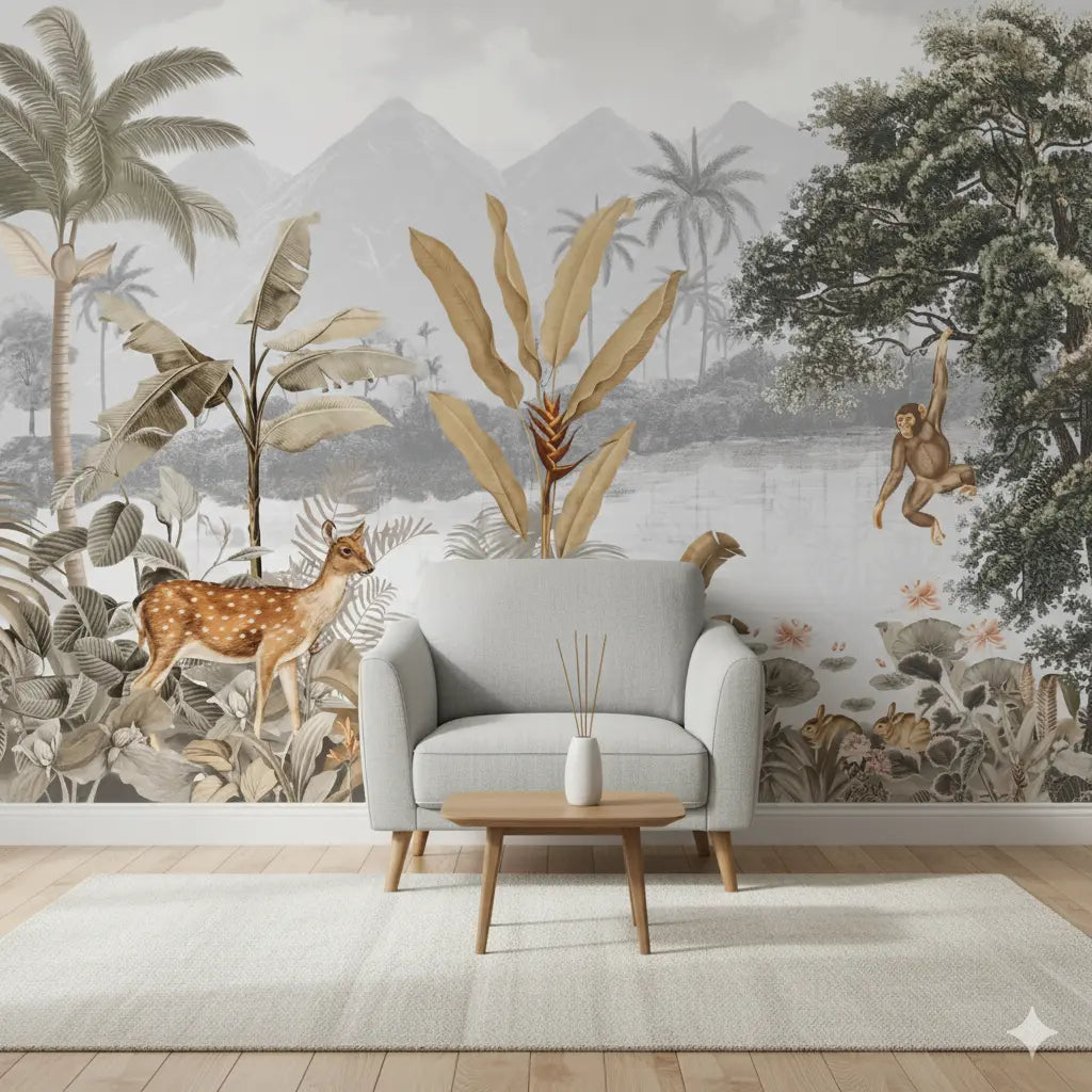 Sepia Jungle Theme Living Room Wallpaper | Cheer Design