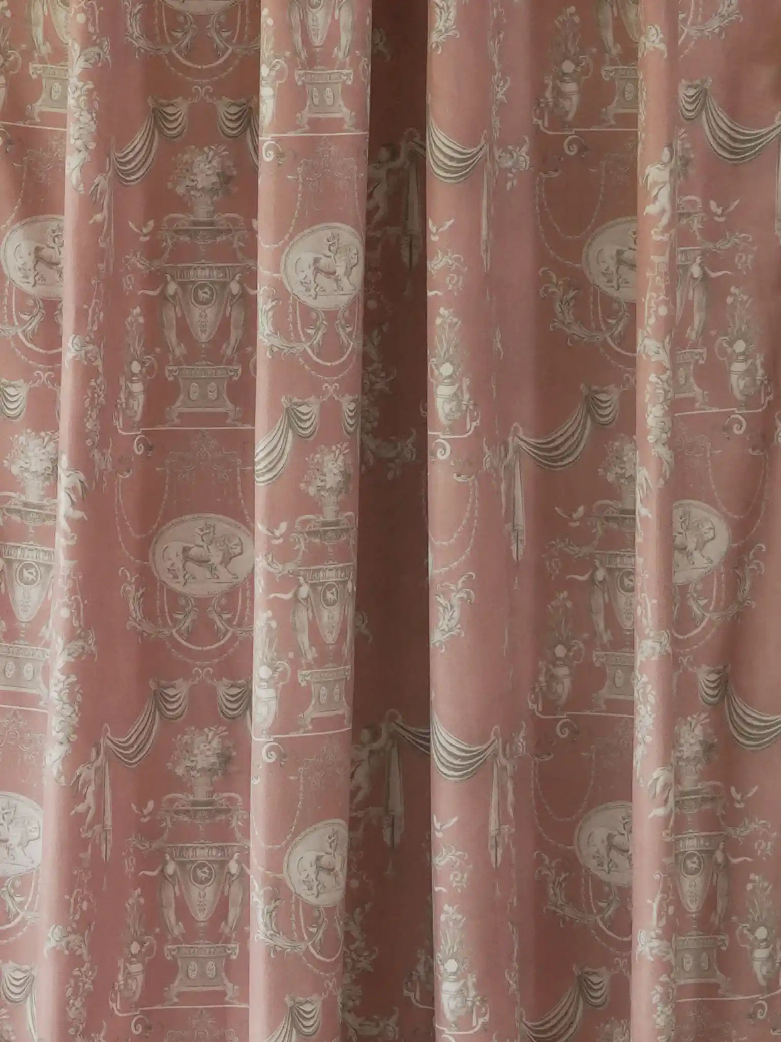 The European Tapestry curtain brings the sophisticated warmth of a French chateau into the modern home. Set against a soft Dusty Rose base, the design features a meticulous Toile de Jouy pattern in muted cream. The motif showcases neoclassical symbols of abundance: ornate flower-filled urns, dancing cherubs, and draped garlands framed within delicate medallions. Adding a layer of tactile charm, the drapes are finished with a generous Cream Tassel Fringe along the vertical edges and the base of the matching ruffled valance. Made in India, these curtains are an exquisite choice for a romantic primary suite, a soft-toned nursery, or a creative reading nook. They are designed for those who seek to anchor their interior with a piece that feels both historically significant and effortlessly feminine.