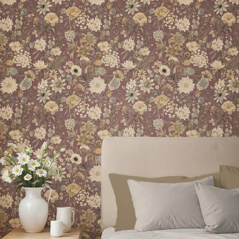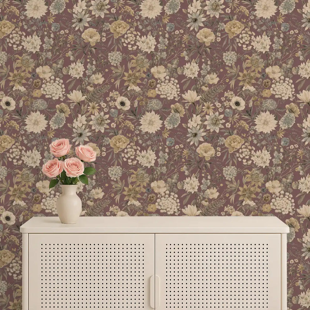 Fresh Floral Wallpaper Roll in Dusky Rosewood Color