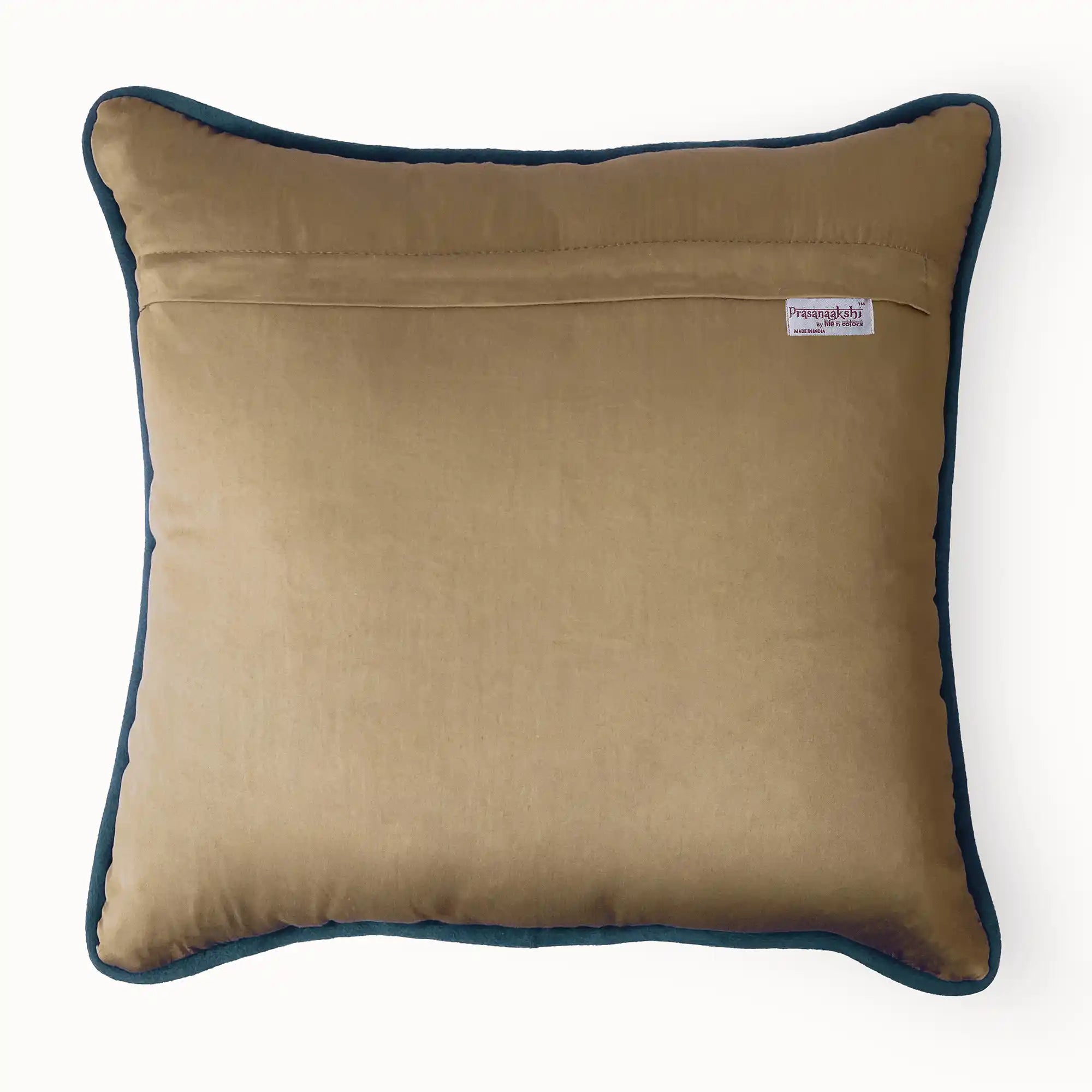 The Golden Scallop Velvet Cushion Cover in teal is made from deep teal velvet with delicate gold embroidery tracing a scallop pattern along the edges. It's a warm, jewel-toned piece that feels classic without being heavy.