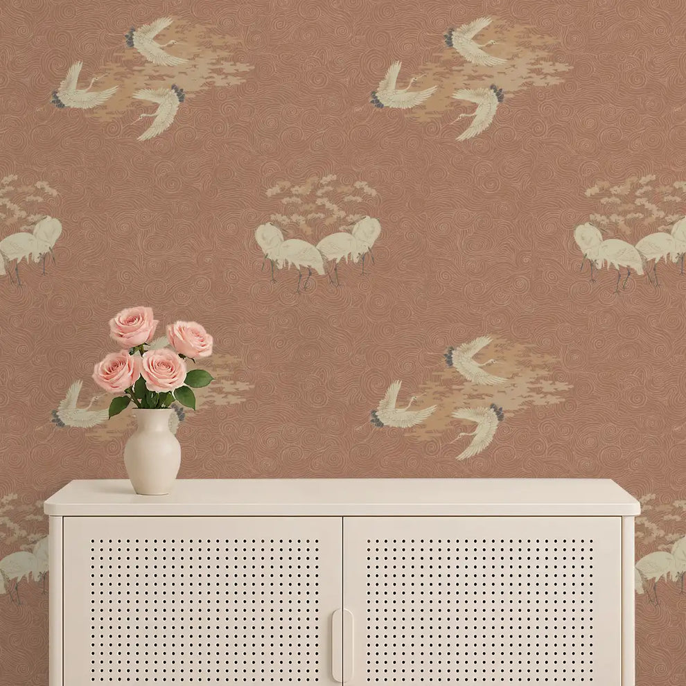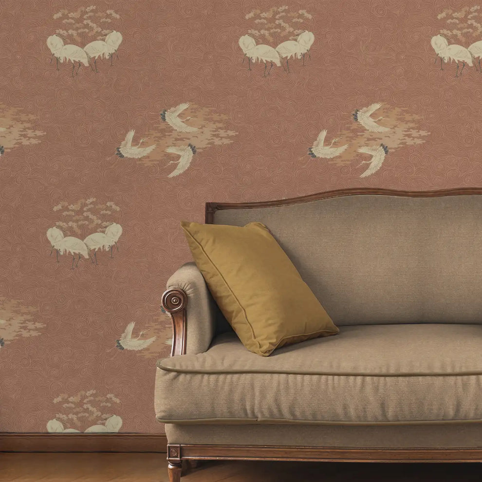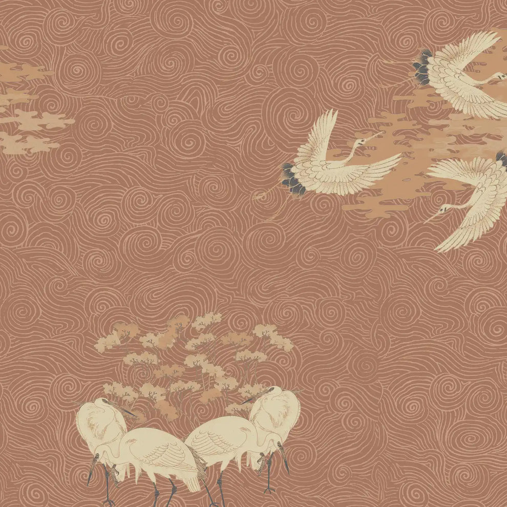 Graceful Cranes Oriental Wallpaper Roll in Clay Brown Color