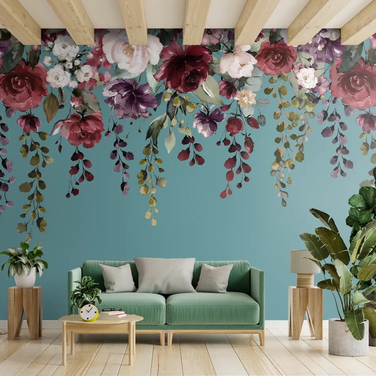Hanging Floral Pattern Teal Color Wallpaper | Custom made | Clear & vibrant prints | Easy to maintain | Lifencolors | Made in India
