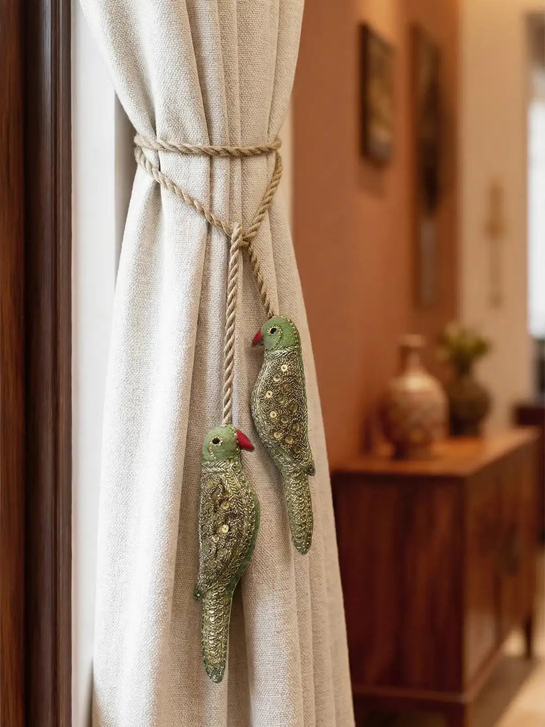 Infuse your living space with whimsical elegance using the Heer Parrot Curtain Tiebacks. Meticulously handcrafted by skilled artisans, these tiebacks feature lush green birds adorned with intricate gold beadwork, sequins, and zardozi embroidery. They are the perfect functional jewelry for your curtains, blending traditional craftsmanship with modern decor.