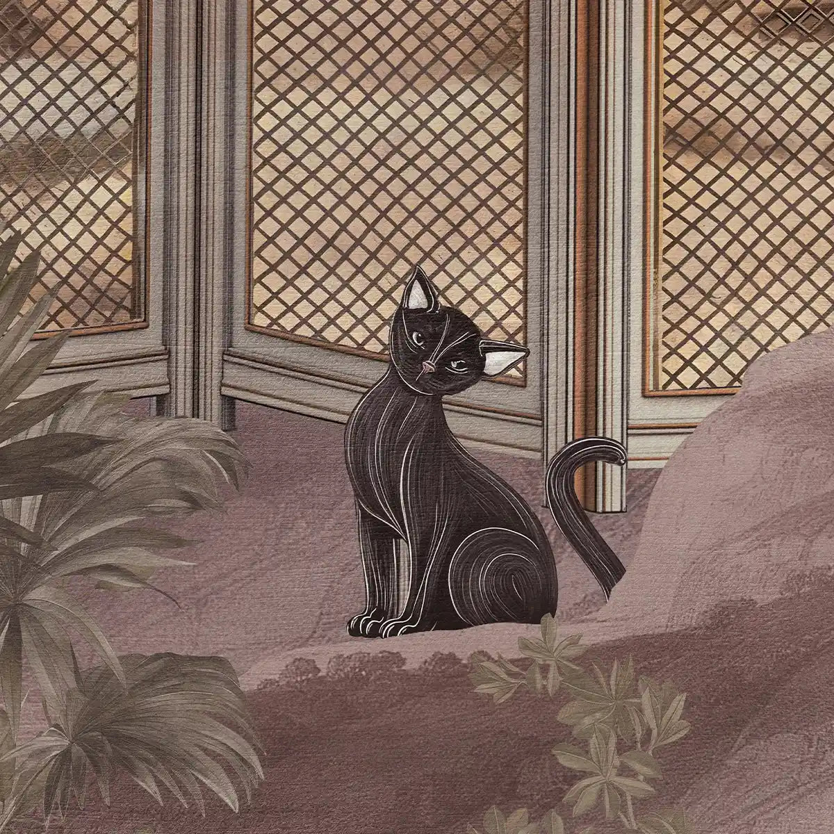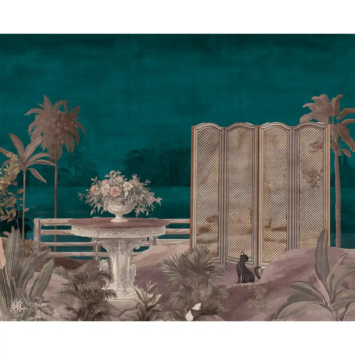 Immerse your interiors in timeless elegance with our In My Garden Tropical Wallpaper in Midnight. This enchanting mural captures a serene tropical garden with palm trees, ornate screens, and floral arrangements set against a deep teal backdrop. A mysterious black cat adds character and intrigue, making the scene both artistic and atmospheric. Perfect for living rooms, dining areas, or boutique interiors, this wallpaper blends tropical luxury with a dramatic midnight palette, transforming spaces into captivating sanctuaries.
