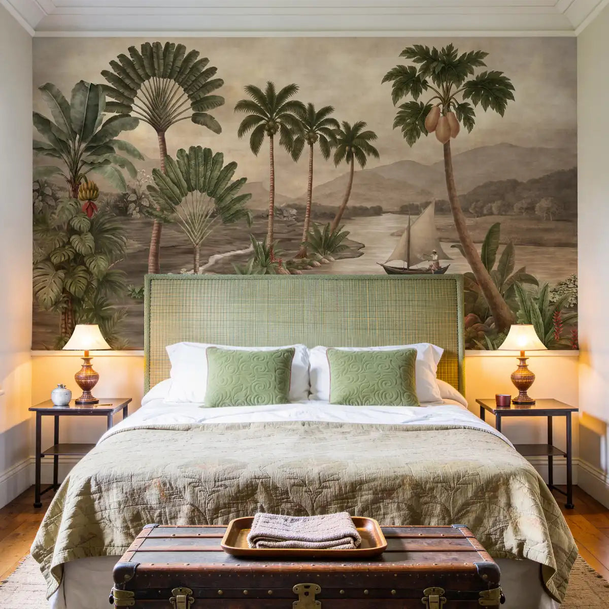 The Indonesia mural turns any room into an immersive gateway to the tropics. Set against a warm, Weathered Sandstone base, the design features a hand-painted "fresco" style landscape. The composition follows the gentle curve of a river where a traditional Pinisi-style sailboat glides past groves of Traveler’s Palms, fruiting Papaya trees, and dense banana leaves. The palette is a masterclass in muted elegance—using Sepia, Sage Green, and Earthen Umber to mimic the soft patina of an antique 19th-century colonial painting. Made in India, this premium wallcover is an exquisite choice for a grand statement living room, a tranquil master suite, or a curated hospitality lounge. It is designed for those who seek to anchor their interior with a sense of adventurous history and restorative calm.