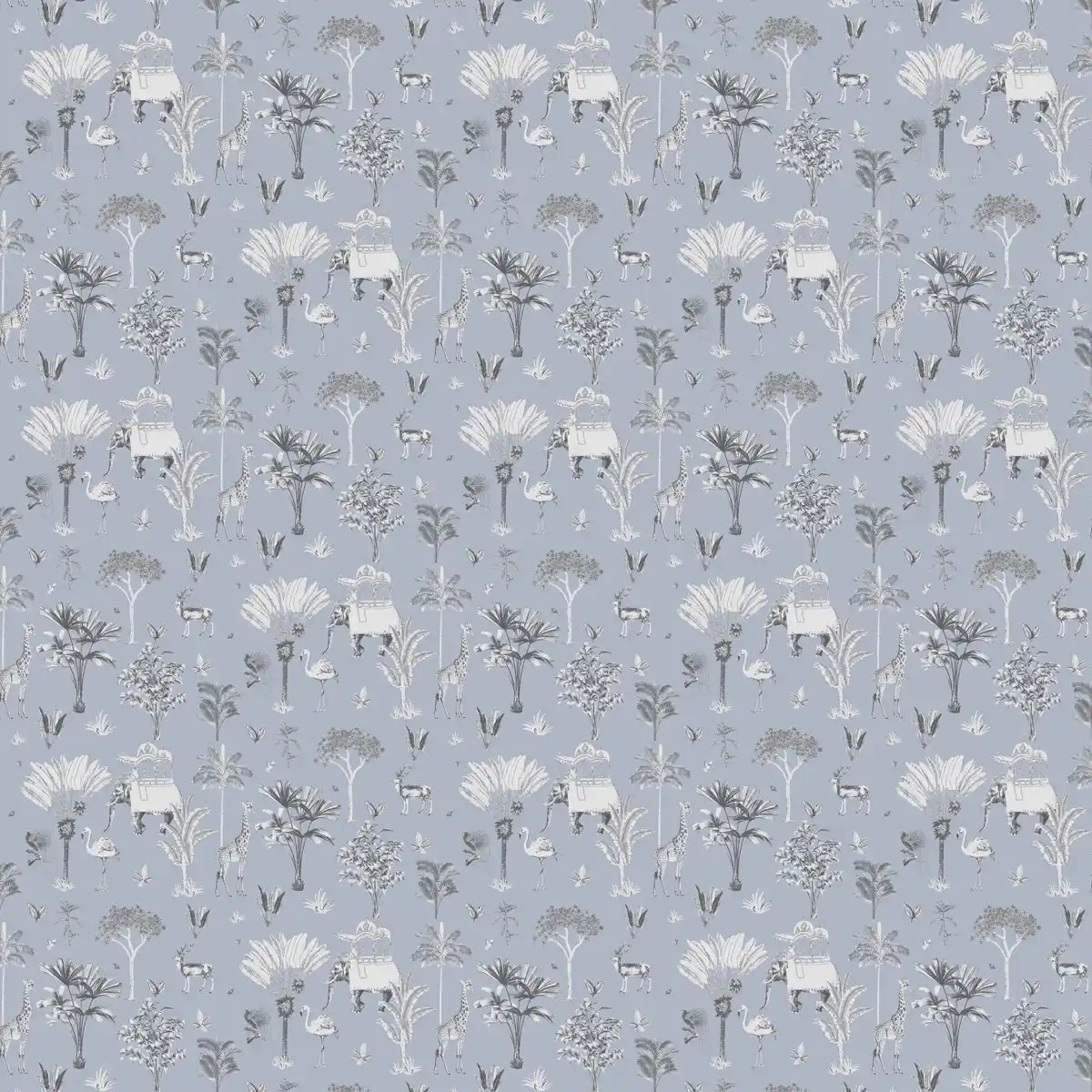 Transform your walls with the Itihaas Powder Blue Wallpaper. This elegant repeating pattern features a charming scenic design, inspired by the vibrant wildlife and lush landscapes of India. Against a soft powder blue background, you'll discover finely sketched illustrations of majestic elephants, graceful deer, exotic flamingoes, and various Indian plants.