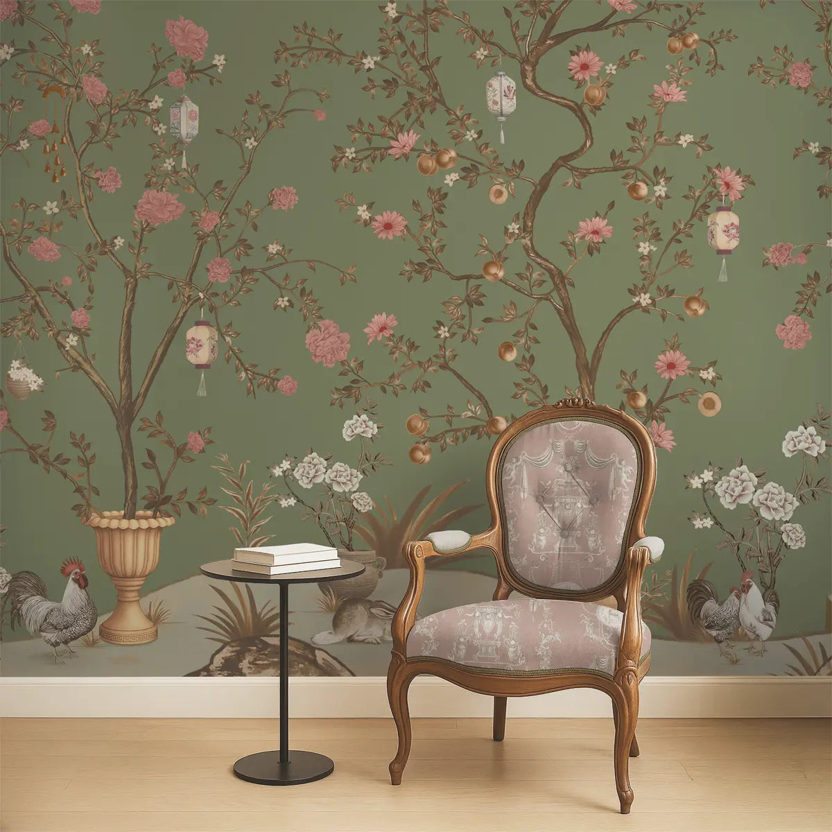 This wallpaper works beautifully in living rooms, dining areas, and bedrooms where you want the richness of a chinoiserie garden. The green tones keep it alive and natural. a garden that glows with quiet beauty.