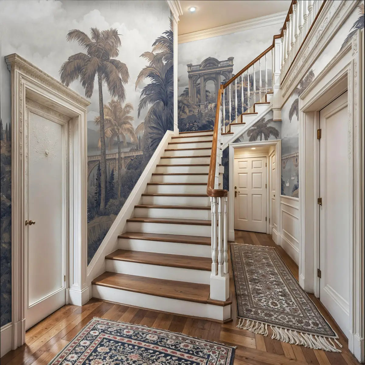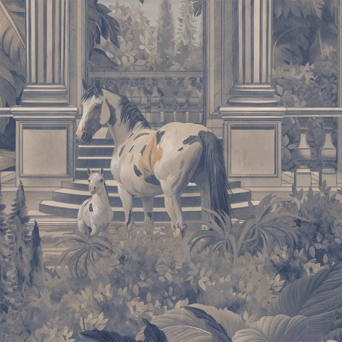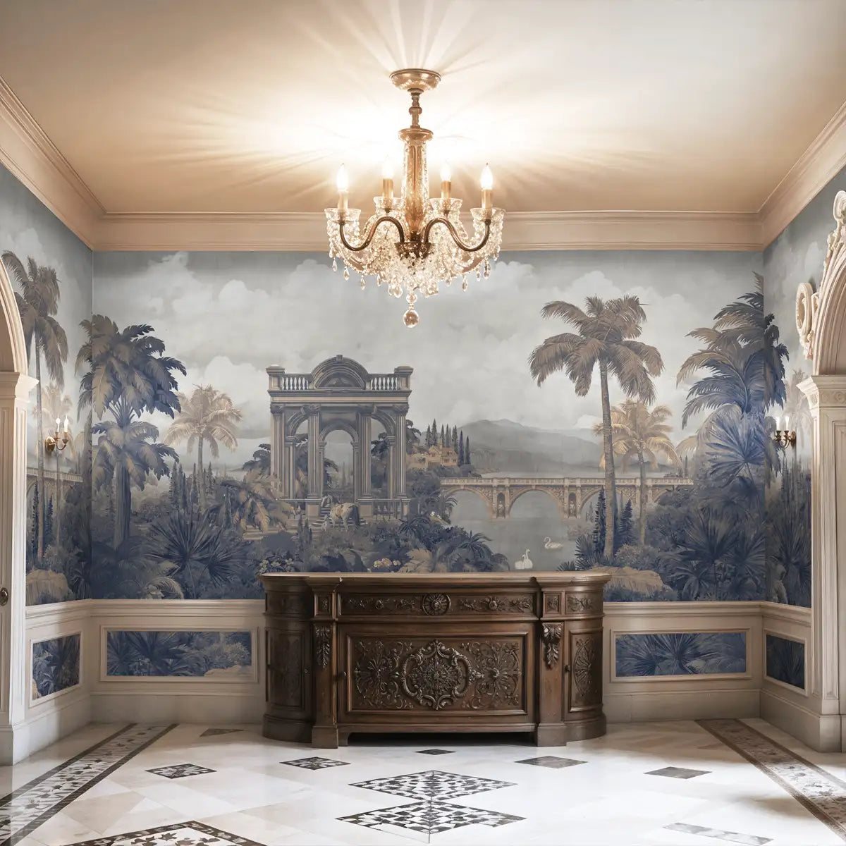 Introducing "Majestic Foliage Epoch Customised Wallpaper Blue & Sepia" A breathtaking panorama reminiscent of a European landscape painting. Majestic trees, Crafted in a variety of captivating blues, frame the scene, their intricate details and lush foliage creating a sense of awe-inspiring beauty.