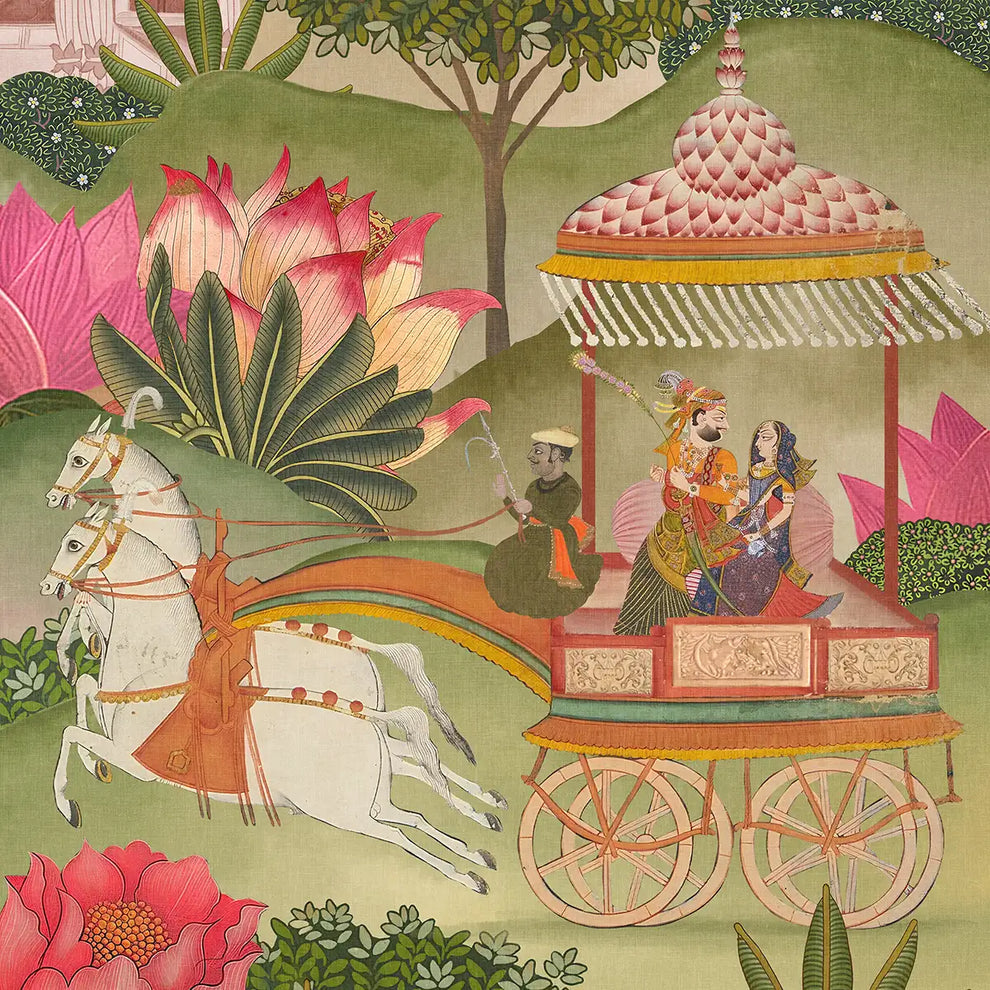Transform your space with the elegance of Mewar Majesty, an exquisite Indian-style wallpaper that beautifully blends tradition and artistry. Featuring majestic mountains, oversized blooming flowers,fort, and intricately designed jharokhas (arched windows), this design captures the regal essence of India's rich heritage.