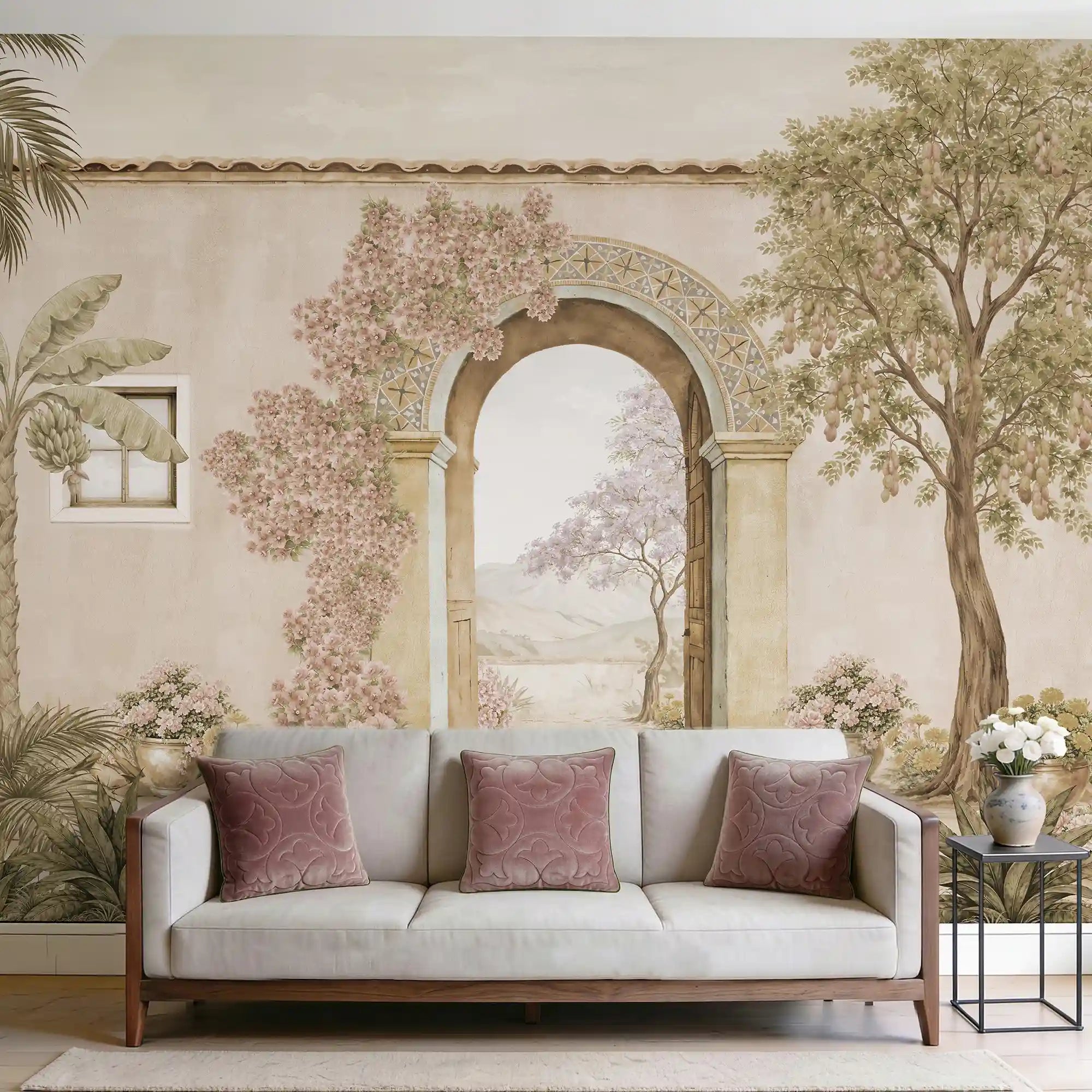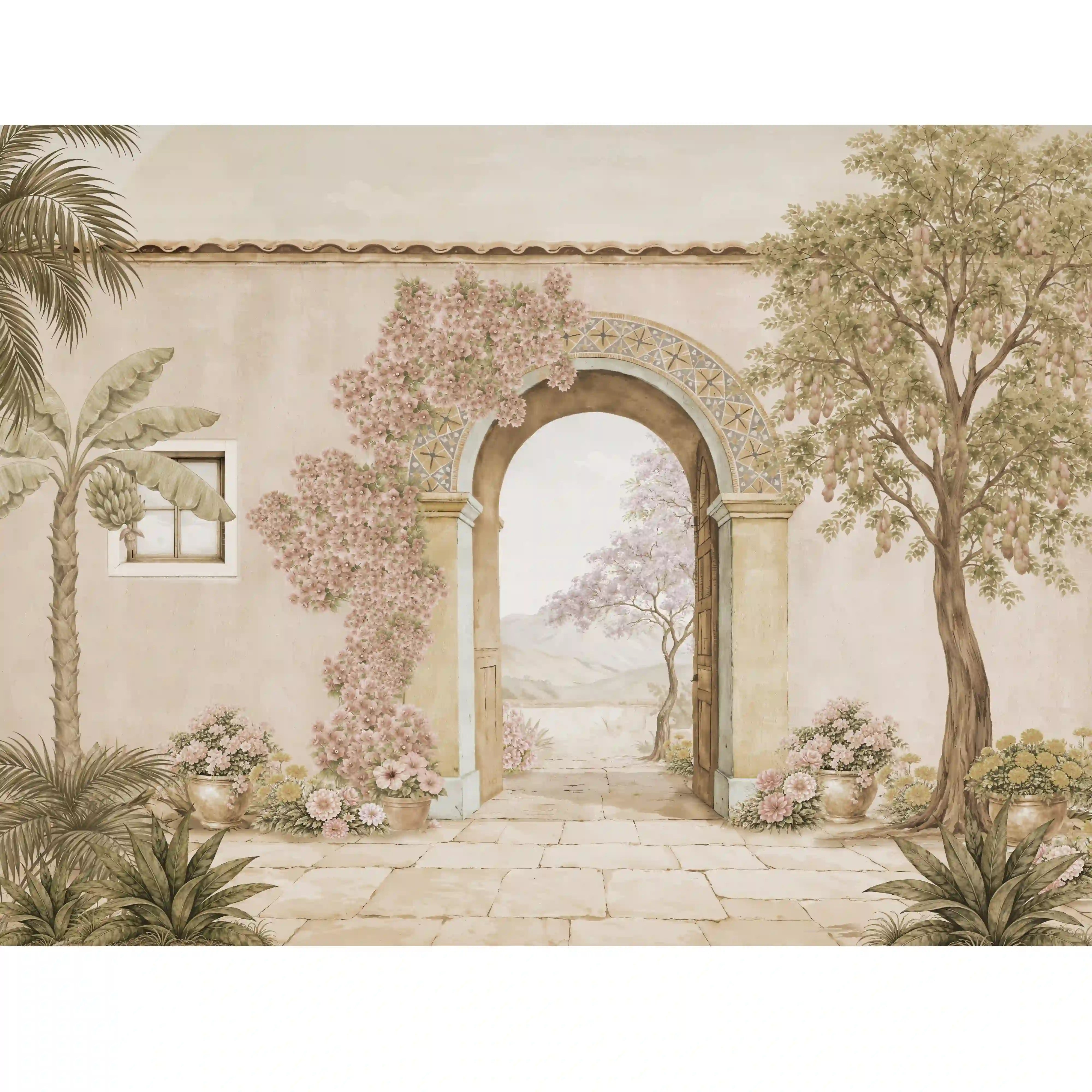 Mexico brings the quiet beauty of a sun-warmed courtyard right into your home. A graceful arched doorway opens into a peaceful landscape beyond, framed by flowering vines, potted plants, and weathered stone. all in a calming monochromatic blue palette that feels like a hand-painted ceramic mural come to life.