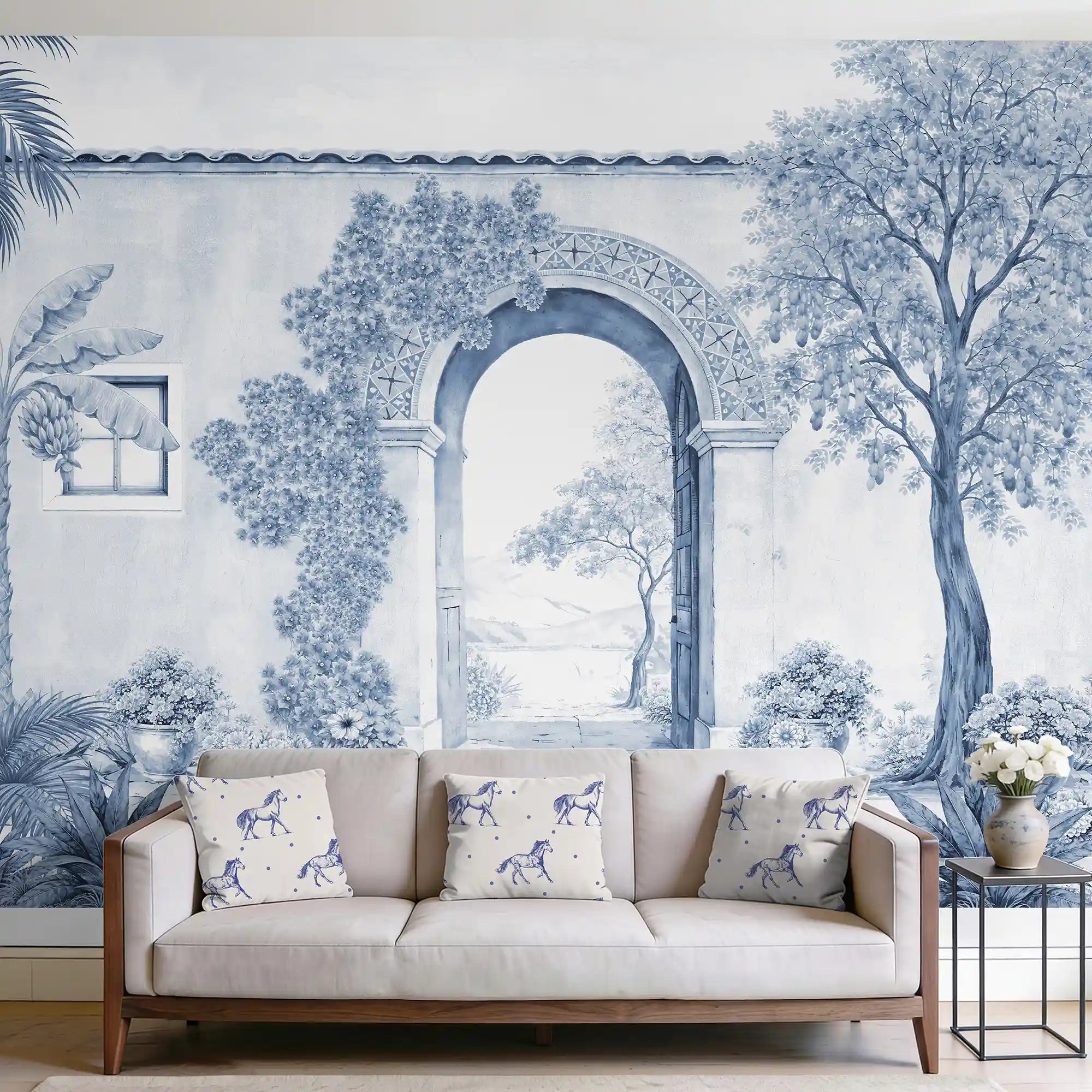 Mexico brings the quiet beauty of a sun-warmed courtyard right into your home. A graceful arched doorway opens into a peaceful landscape beyond, framed by flowering vines, potted plants, and weathered stone. all in a calming monochromatic blue palette that feels like a hand-painted ceramic mural come to life.