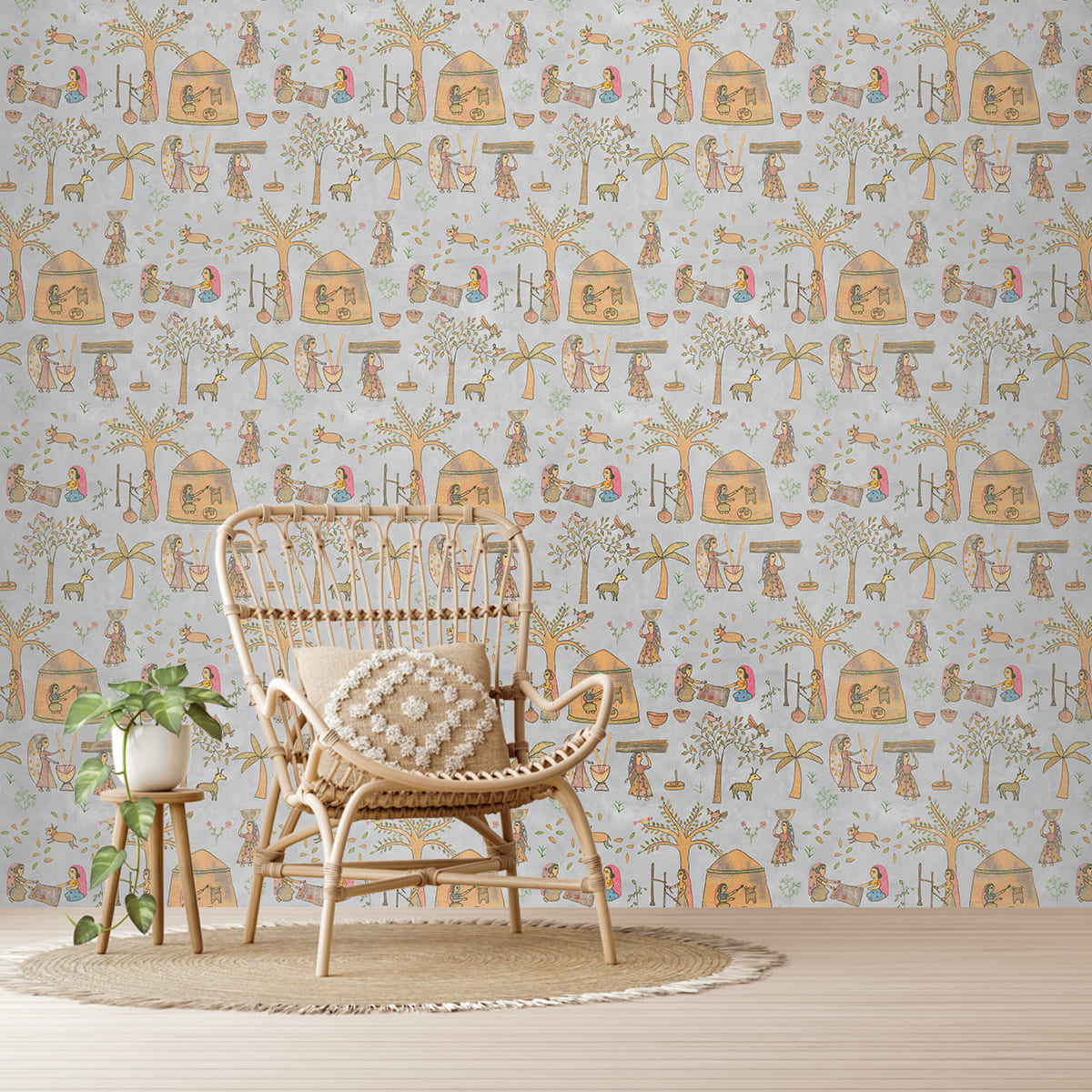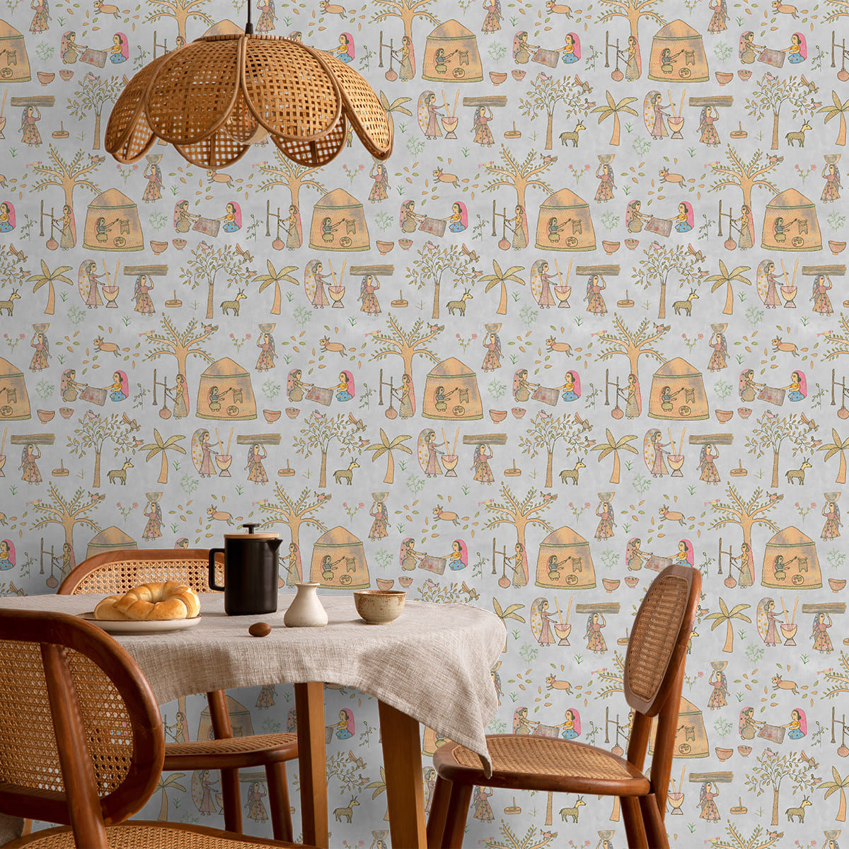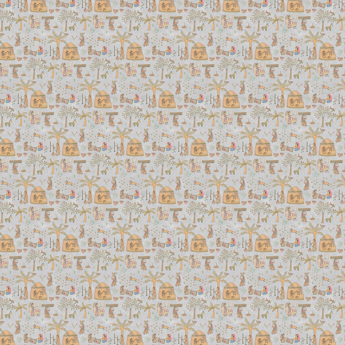 Introducing Mithila, a wallpaper that weaves together the artistry of Sujani with the vibrant tapestry of rural life in the heartland of Mithila. This wallpaper is a tribute to the enduring traditions of Mithila, where art and daily life are seamlessly intertwined. It's a window into the soul of Mithila and each stroke paint a vivid picture of the rustic beauty that thrives in Mithila's countryside. Grey