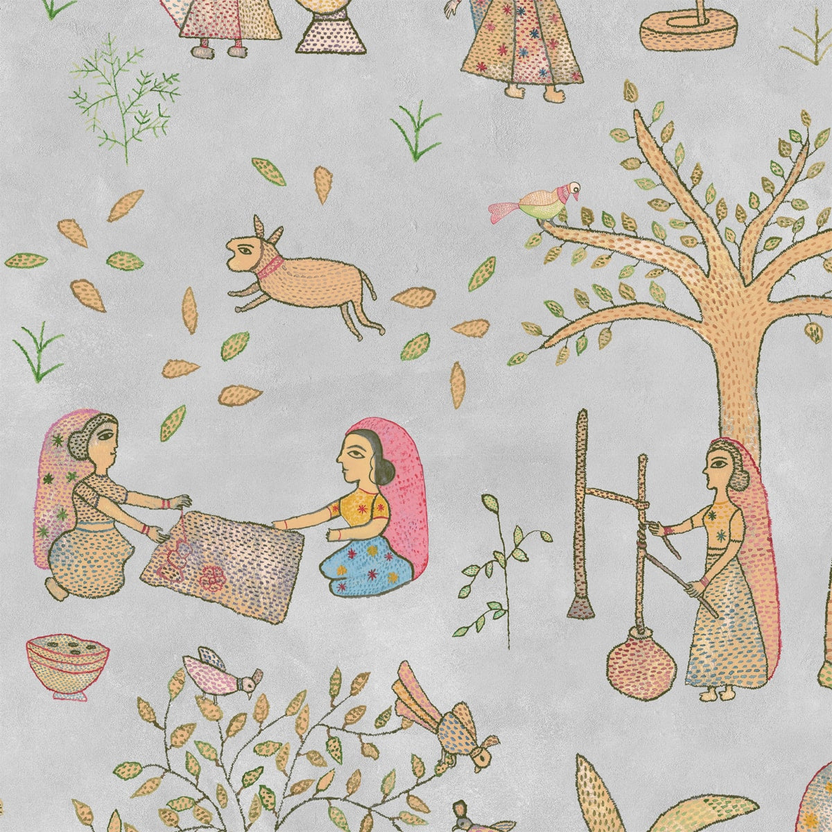 Mithila Indian Folk Sujani Art Grey Wallpaper for Wall
