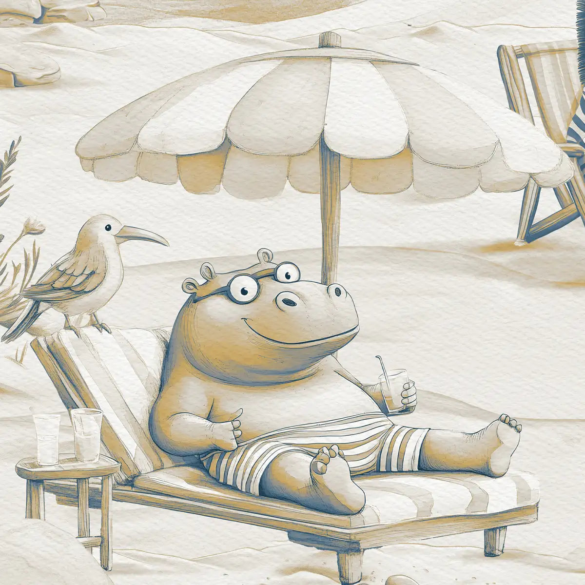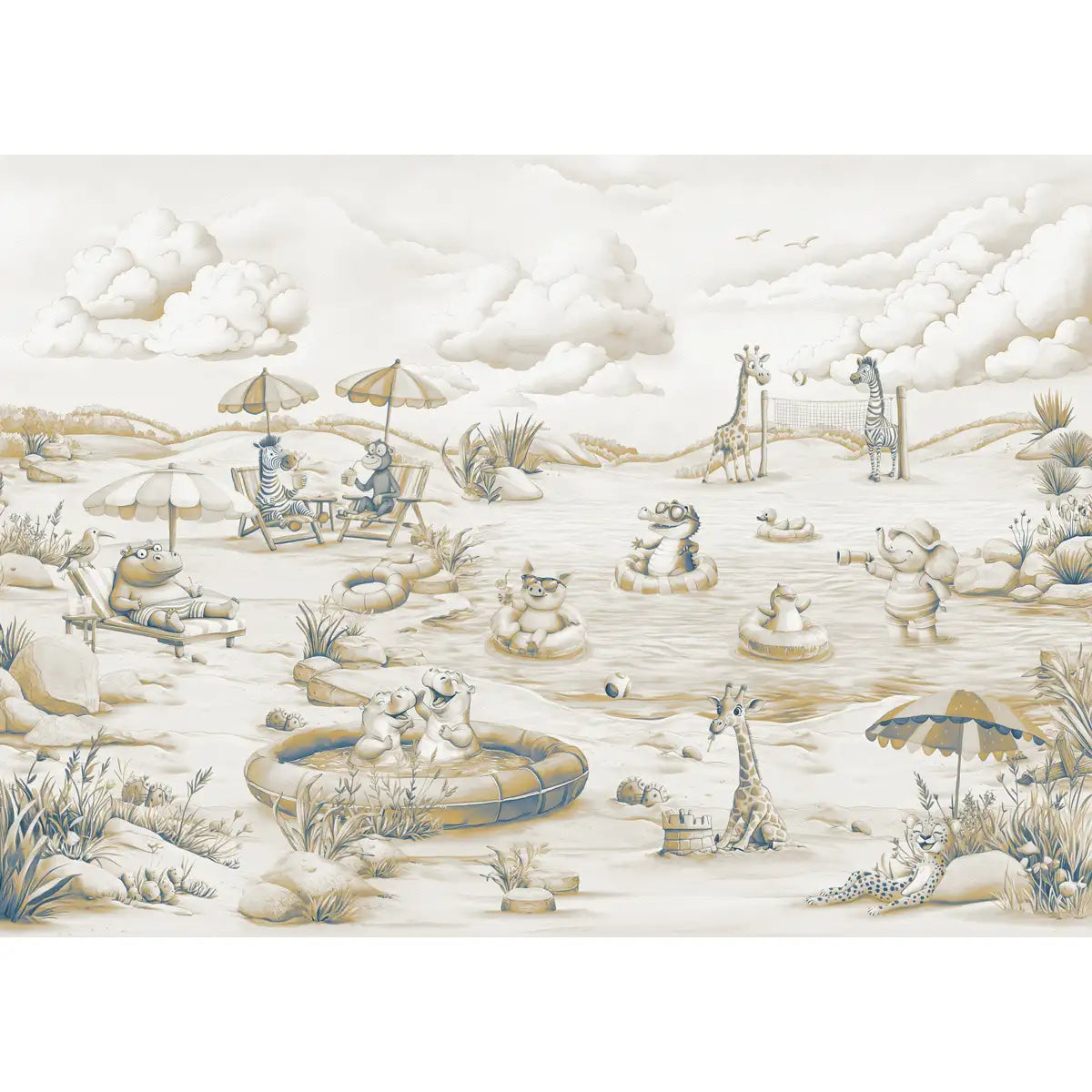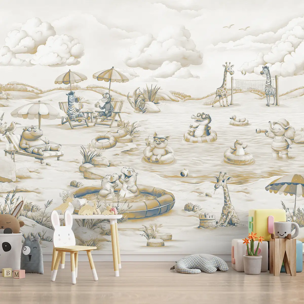 This whimsical kid's wallpaper features a light, airy scene with adorable animals enjoying a beach day