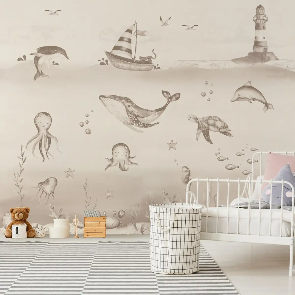 Ocean World, Kids Room Wallpaper, Customised Sepia Color