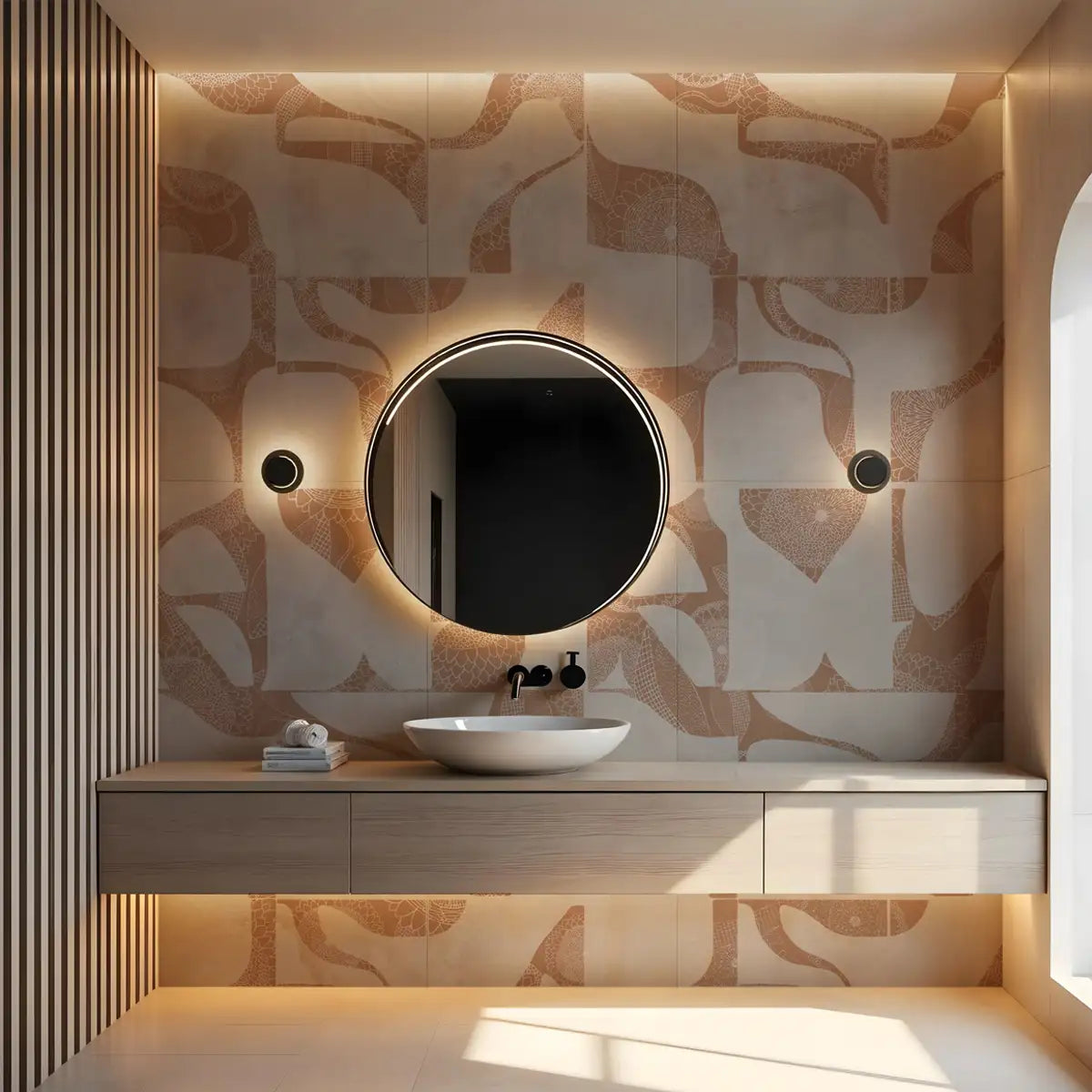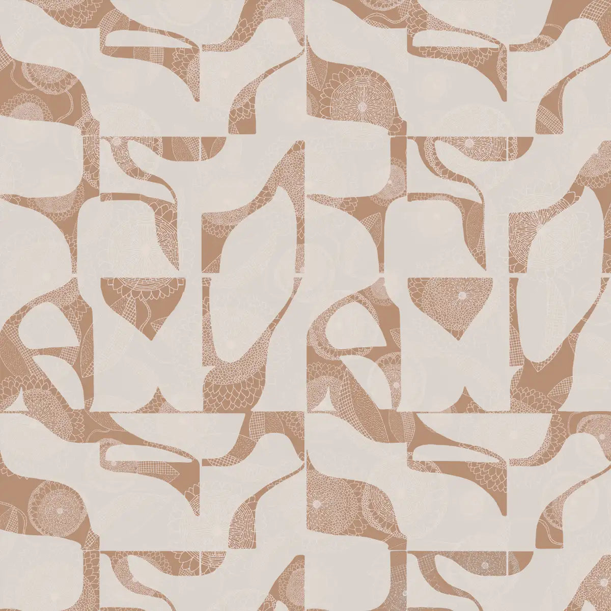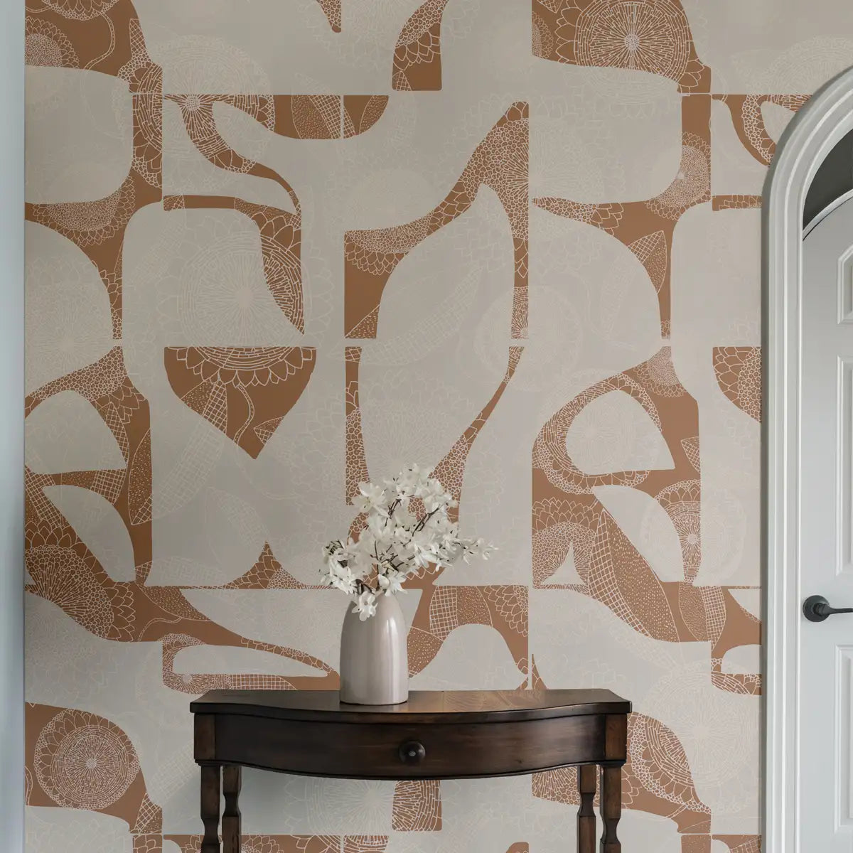 Floral silhouettes meet geometric layers, echoing sunlit petals on textured stone.