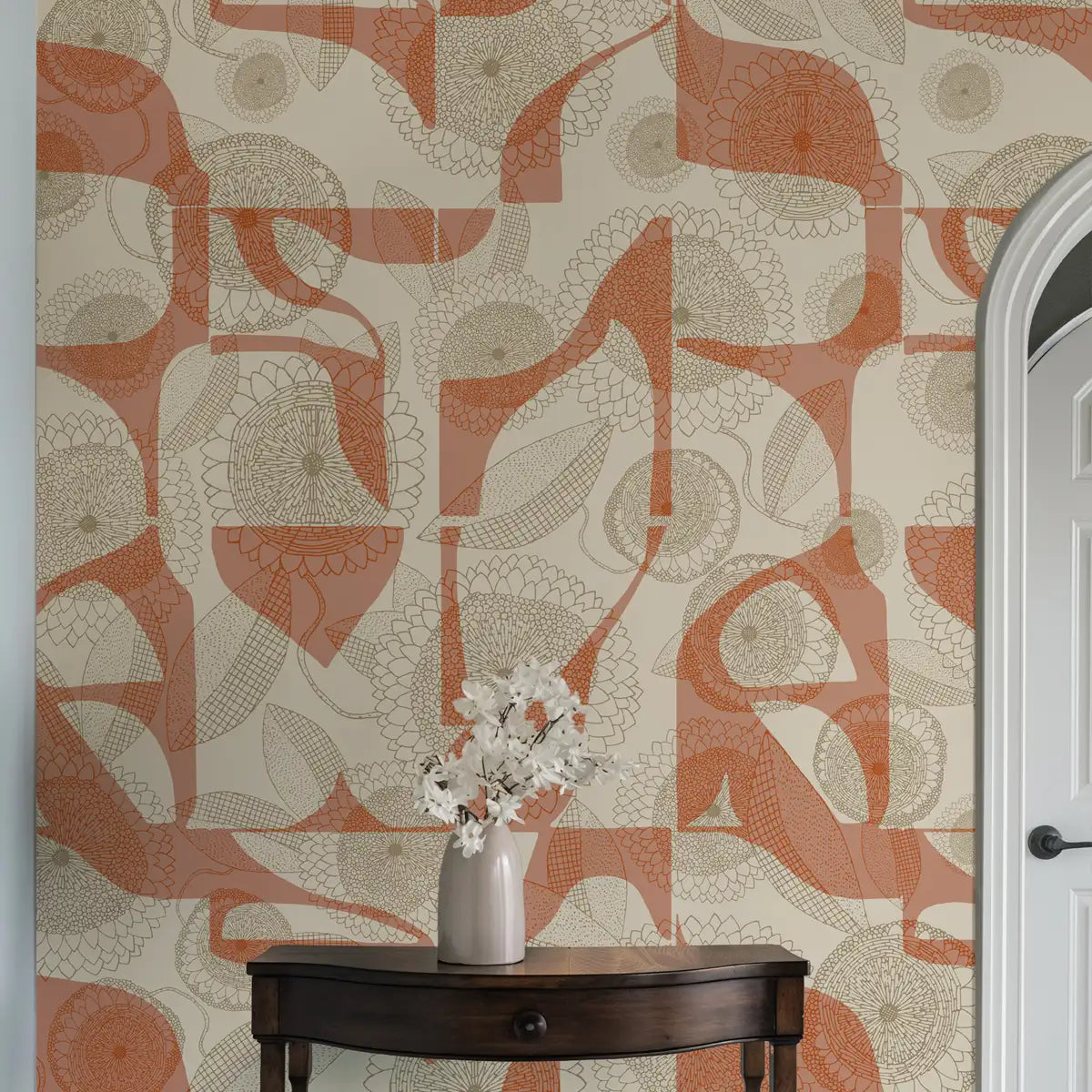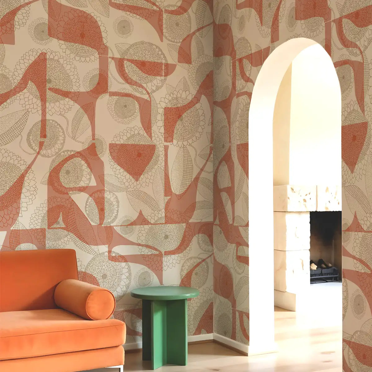 • Floral silhouettes meet geometric layers, echoing sunlit petals on textured stone.